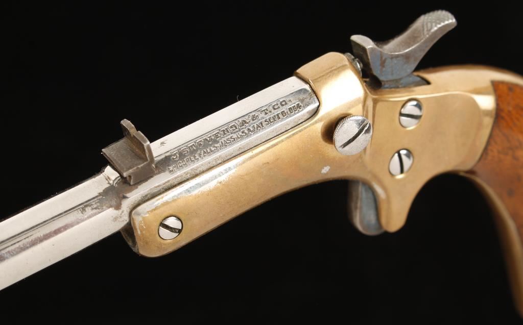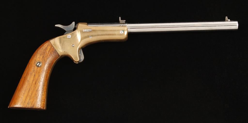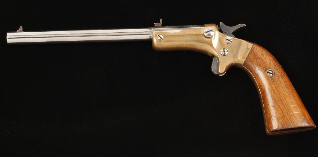 Nickel plated and brass single-shot tip-up pistol with a 6" barrel. Plated barrel is in 95%+ condition. The bore is in rough shape with rifling. The brass frame is in good condition. The function is correct. The smooth wood grips have numerous dings. Condition is fair to good,. *Modern Firearm*