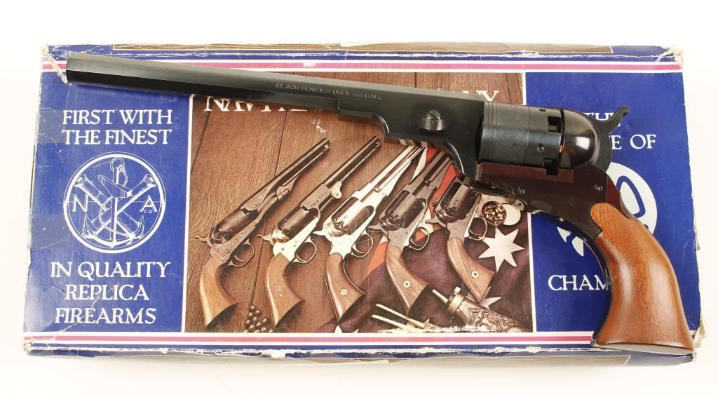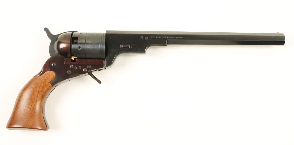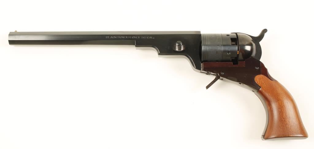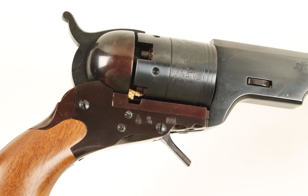 Replica blued black-powder 6-shot folding trigger percussion revolver with a 9" octagon barrel. Bluing is immaculate although the frame and backstrap are turning to plum. A stage coach hold-up scene is roll-stamped on the cylinder. The wood is faultless but it is not a good fit. Bore is bright and shiny. Action works well. Includes factory Navy Arms box with multi-tool. Condition is excellent. *Antique Firearm*