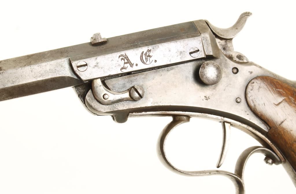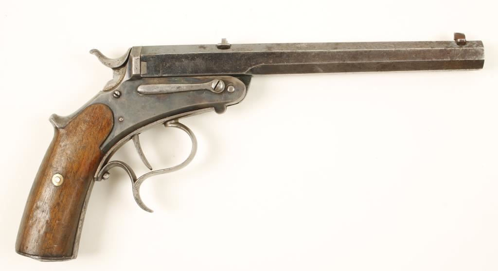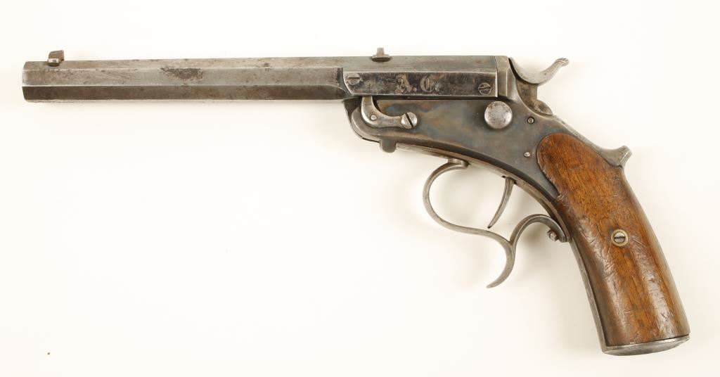 Blued and case colored single shot pistol with a 7-7/8" octagon barrel. Steel has pitting, surface rust, dings and scratches. Wood has many dents, dings and rubs and may have shrunk away from the frame edges. Bore is shiny with worn rifling. Action works well. Condition is fair. *Antique Firearm*