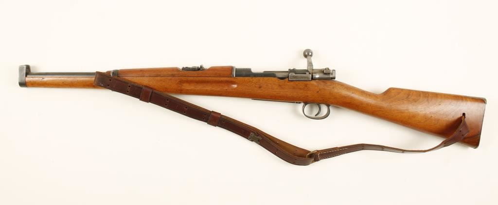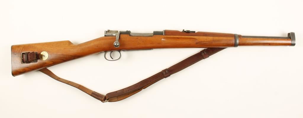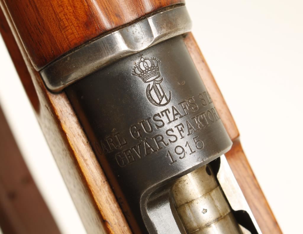 Swedish military blued bolt-action carbine with a 18" barrel and a leather sling. Serial numbers are mixed. Made by Carl Gustafs in 1915. Bluing is faded with a few scratches, rust stains and edge wear. Wood has the brass stock disc, relatively few dings, rubs and scratches and a small crack at the upper tang. Bore is shiny with rifling. Action is fine. Condition is very good. *Modern Firearm*