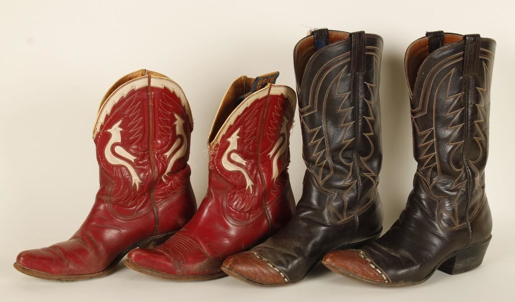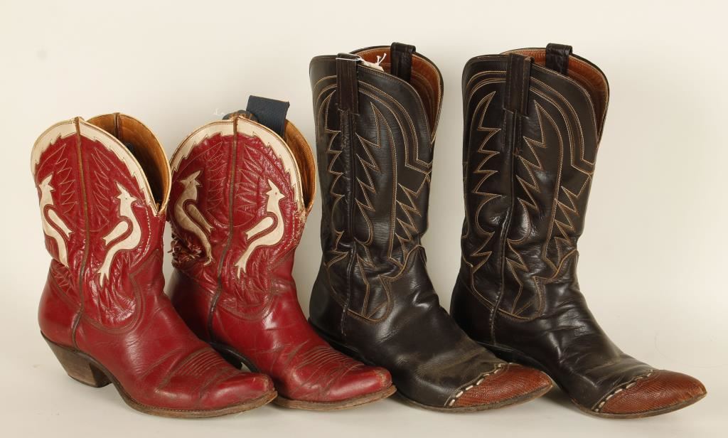 Including; a pair of Gold Bond red cowboy boots with white bird design, size 6-back of left boot's leather is splitting, and a pair of black cowboy boots with snakeskin tips by Sanders.