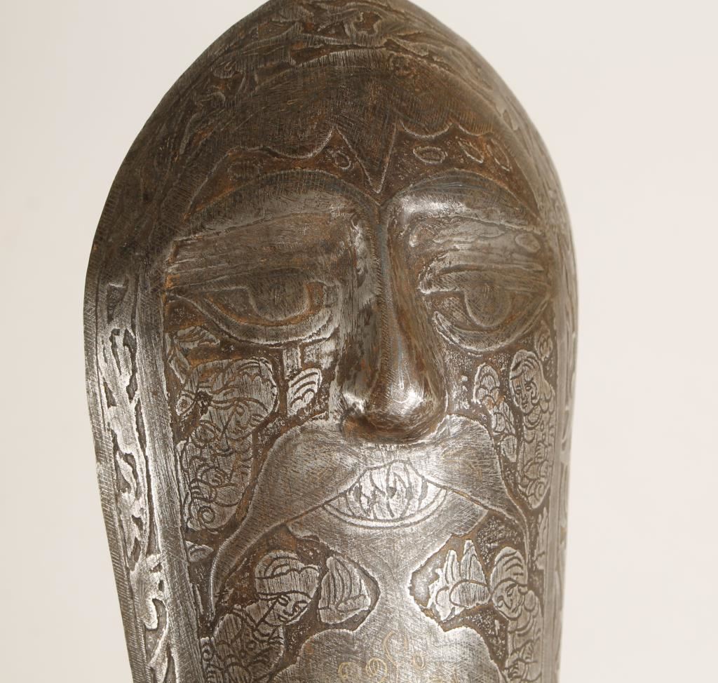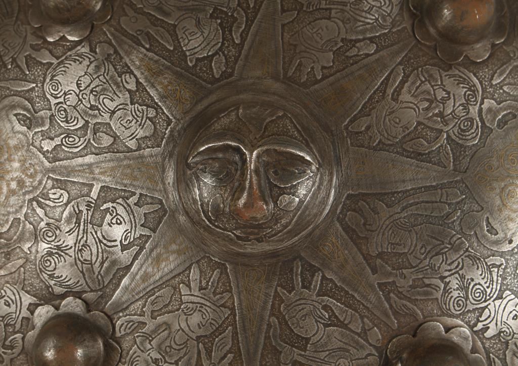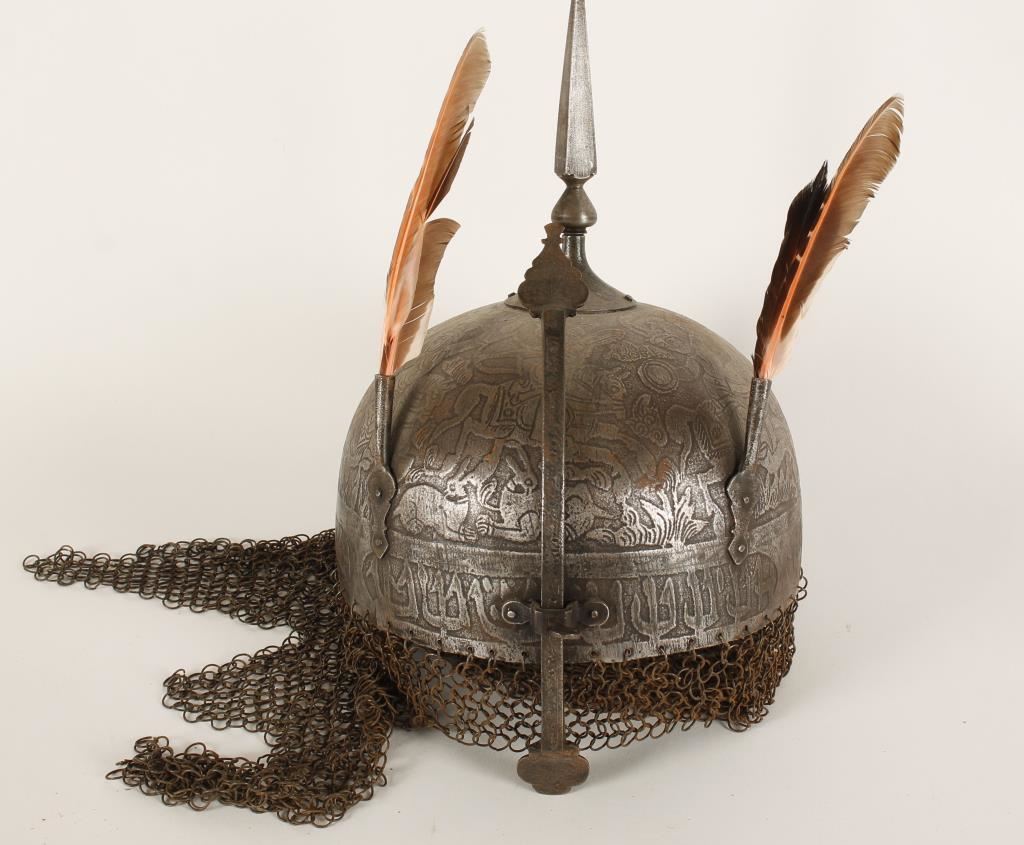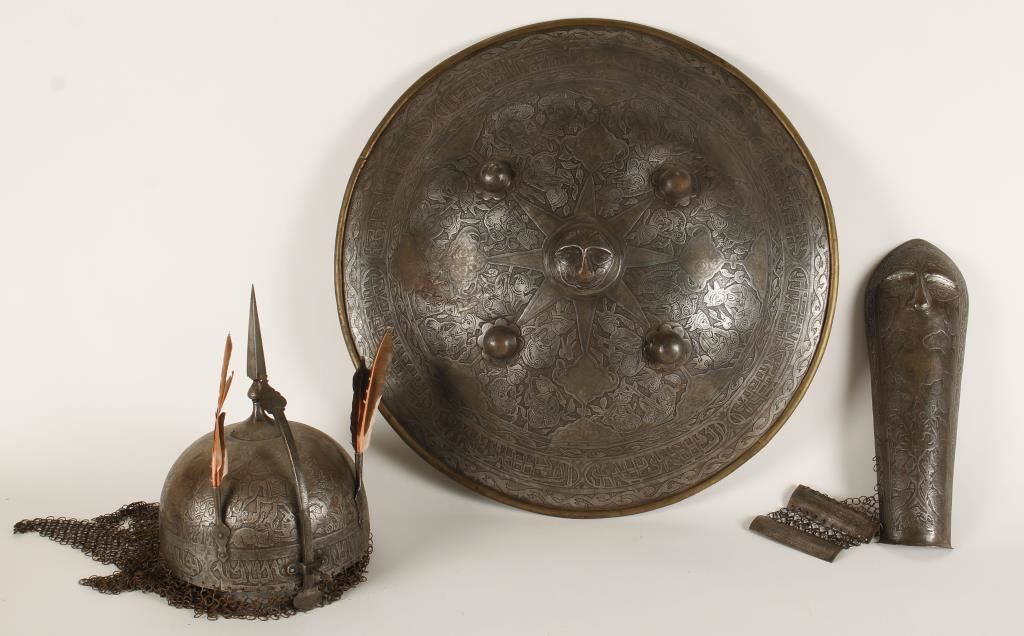 Indian helmet, shield and armor piece. Writing around rim of helmet, which is also decorated with soldiers riding horses and large point on top of helmet with two feathered decorations. 19th century. Matching shield has sun design in the middle and figures around shield, same Middle Eastern writing around the rim.