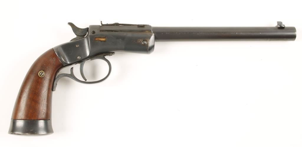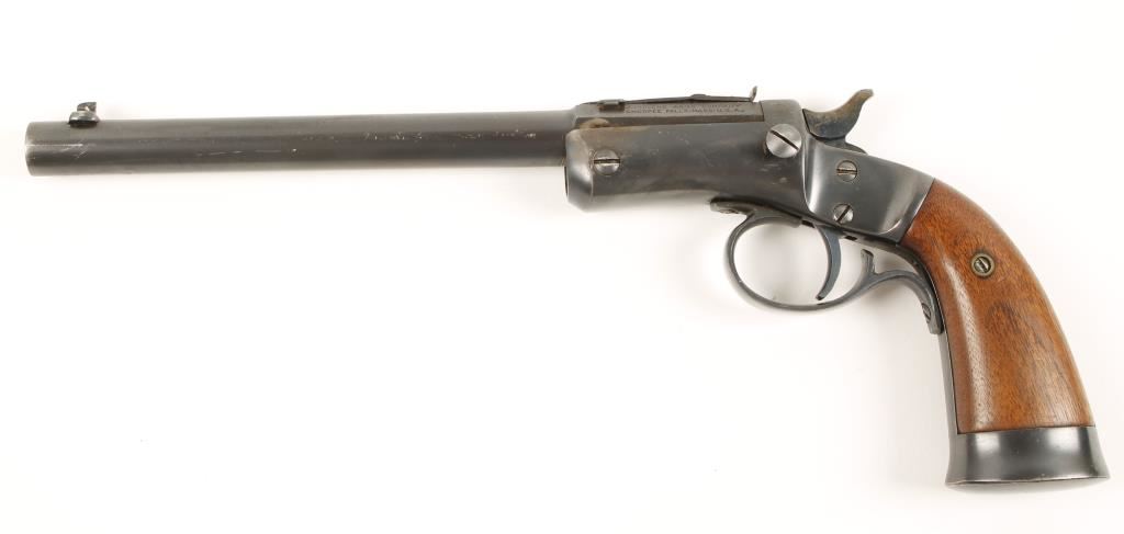 Blued single-shot tip-up pistol with an 8" barrel. Finish is good with only a few slight scratches and edge wear. Function is good. Bore is clean with rifling. Wood grips have one ding. Condition is very good. *Modern Firearm*