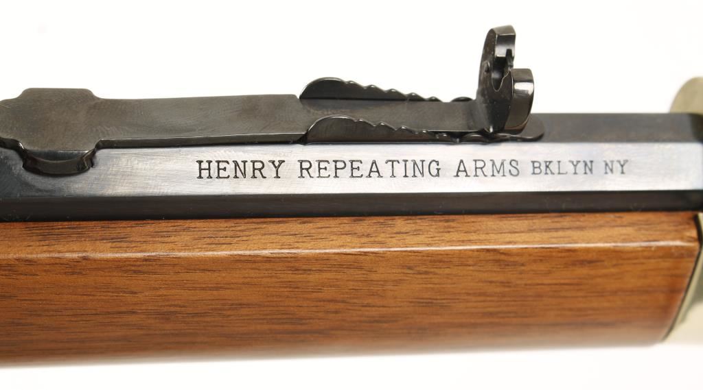 Lever-action, golden-colored receiver rimfire rifle. 19" blued octagonal barrel with winged rear sight. Bore is shiny with good rifling. Bluing is 100% on barrel, tubular magazine, lever, hammer, and trigger. Gold coloring on the receiver is cloudy, but unmarked. Butt stock's golden coloration is in excellent condition without marring. Wooden stock and fore grip are in like-new condition. Action is in great working order. It does show a small amount of usage. Comes with original box with paperwork. Overall condition is "Excellent". Modern Firearm