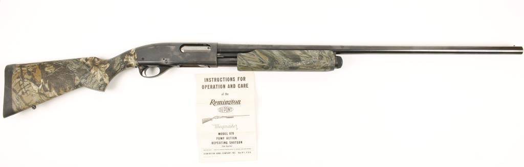 Pump-action shotgun with a manufacture date of 1955. Blued 29-1/2" 2-3/4" or shorter chambered full-choke barrel with minor surface rust on the right side. Bore is smooth and un-pitted. Receiver has some bluing loss on normal contact wear points and minor dings and external pitting. Bolt carrier and action are in good working condition. It has new polymer stock and foregrip in woodland laminate print. Comes with original 1953 instructions and care guide. Overall condition is Good. Modern Firearm