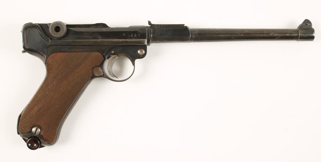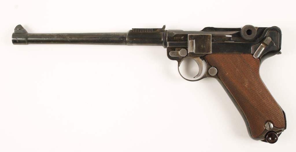 1918 dated P08. Blued single-action semi-automatic pistol with an 8" barrel and one magazine. A parts gun made-up from 2 different numbered pistols. The barrel, extension and parts have serial number 2208 (or 08) and the frame and its parts have number 1778g (or 78). The possibly reblued finish has wear, fading and much pitting on the barrel. The adjustable rear sight has been replaced with a fixed sight and the front sight is not adjustable. The frame and parts have wear to the back strap and side plate with nickel plated takedown bolt, grip screws, safety lever, mag catch and trigger. The grips are checkered walnut and are complete with 2 dings. The magazine is plated with a plastic floorplate. The bore is dark with strong rifling. Condition is fair. *Modern Firearm*