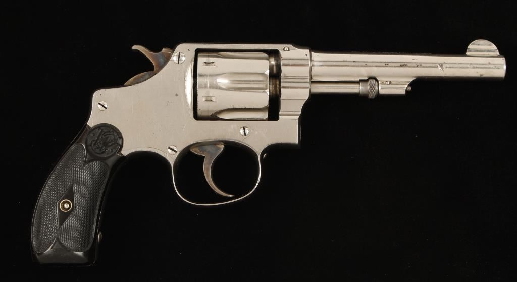 Nickel plated double-action 6-shot revolver with a 4-1/4" barrel. Model 1903 2nd change. Finish is starting to dull with a few flakes missing from the cylinder and the barrel. There is a drag line. Color cased hammer and trigger still have lots of color. The hard rubber grips are in very good condition with only a few small dings. The bore and chambers are bright and clean. Action is smooth and without play. Condition is very good. *Modern Firearm*