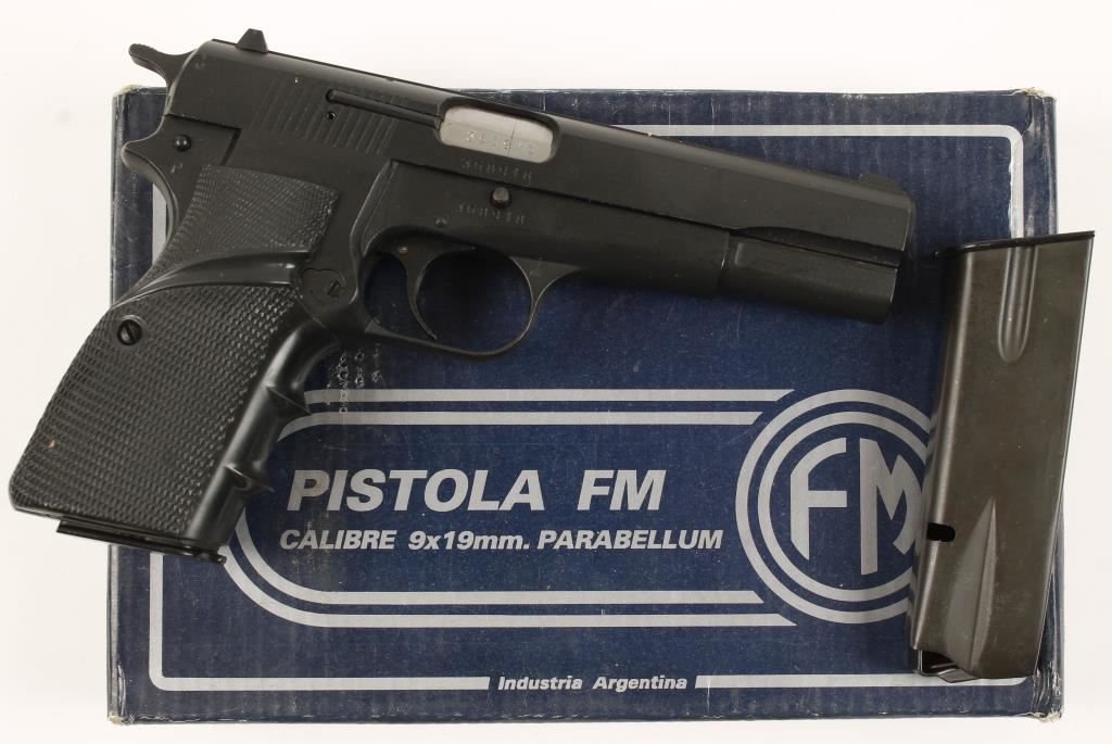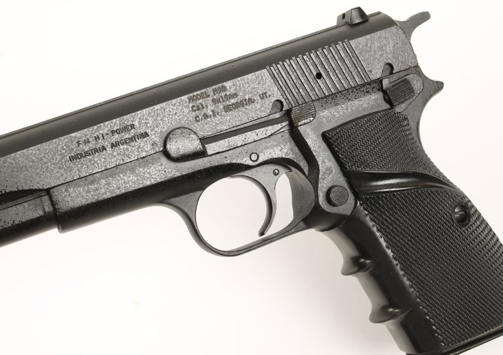 Argentine single action semi automatic pistol. Black parkerized finish,licensed copy of Browning Hi-Power Design, 4-5/8" barrel, fixed 3 dot sights,magazine safety, in original box with 2 13-round magazines and cleaning rod. Bore is very good. Condition is like new in box. *Modern Firearm*