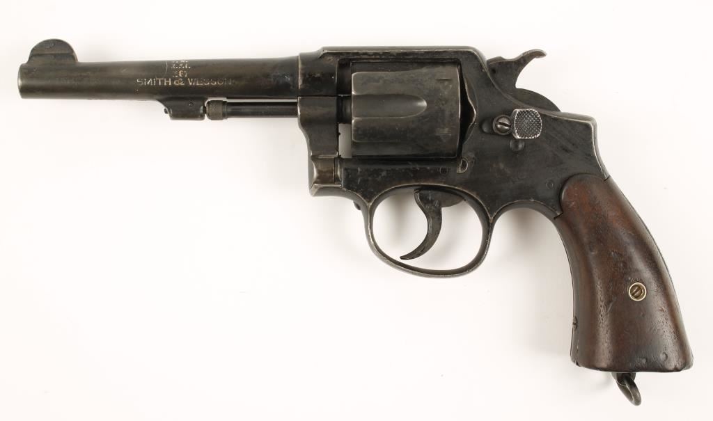 British military firearm. "Black Magic" finished double-action 6-shot revolver with a 5" barrel. Factory Rebuild in 1967. Finish is well worn with what may be paint over the original finish. The bore is bright and shiny, the cylinder has 2 serial numbers on it with the one that doesn't match the frame having been struck through. Chambers are dirty but fine. Functions fine with a loose lock-up. Plain smooth wooden grips that have dings and are worn below the grip strap line. Condition is fair
