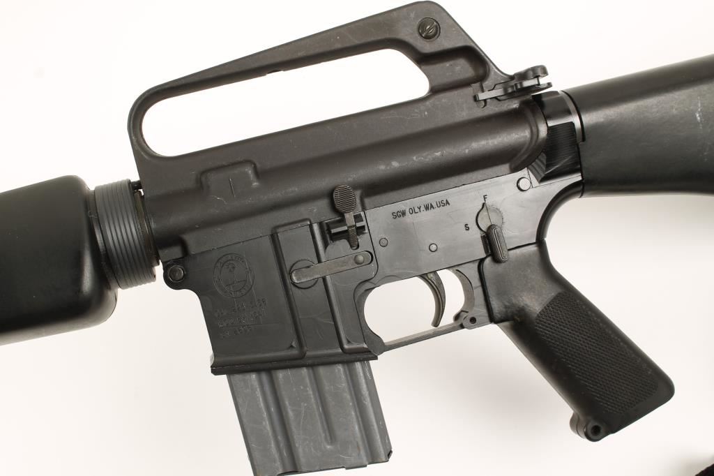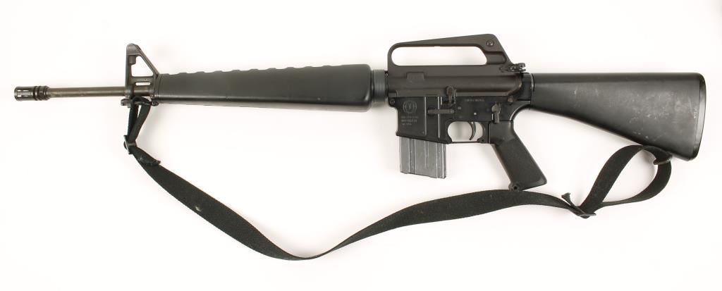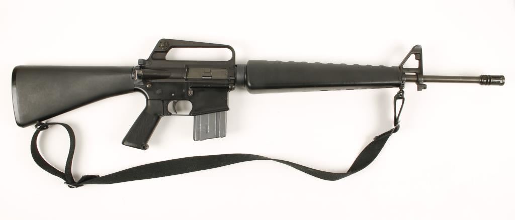 Blued and anodized AR-15 style rifle with a 21" barrel (including flash hider) and one magazine. Has M-16 style stock and forend. Blued barrel and front sight have edge wear. Parkerized upper has little wear. Milled lower receiver is black anodized and has a little edge wear. Forend and butt stock are loose and have a few dings and rubs. Pistol grip has sharp checkering. Bore is bright and shiny. Action works well. Includes a black web sling. Condition is good. *Modern Firearm*
