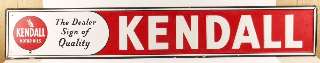 Long Kendall oil sign. "Kendall, The Dealer Sign of Quality" plus the Kendall motor oil logo. Single sided 72" long by 12" wide. Overall condition very good.