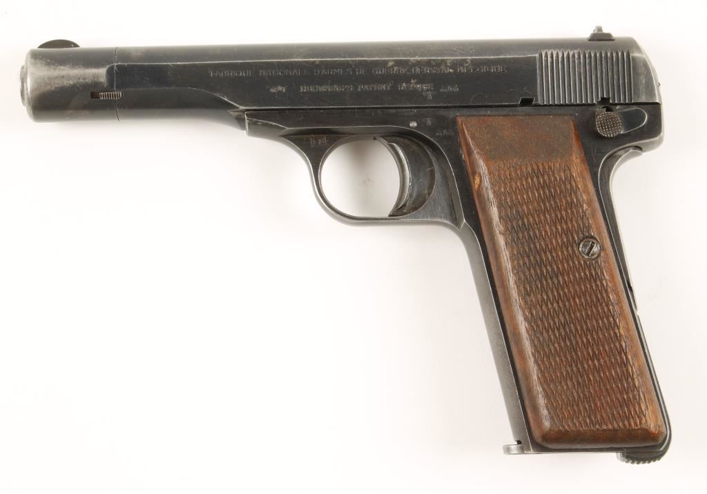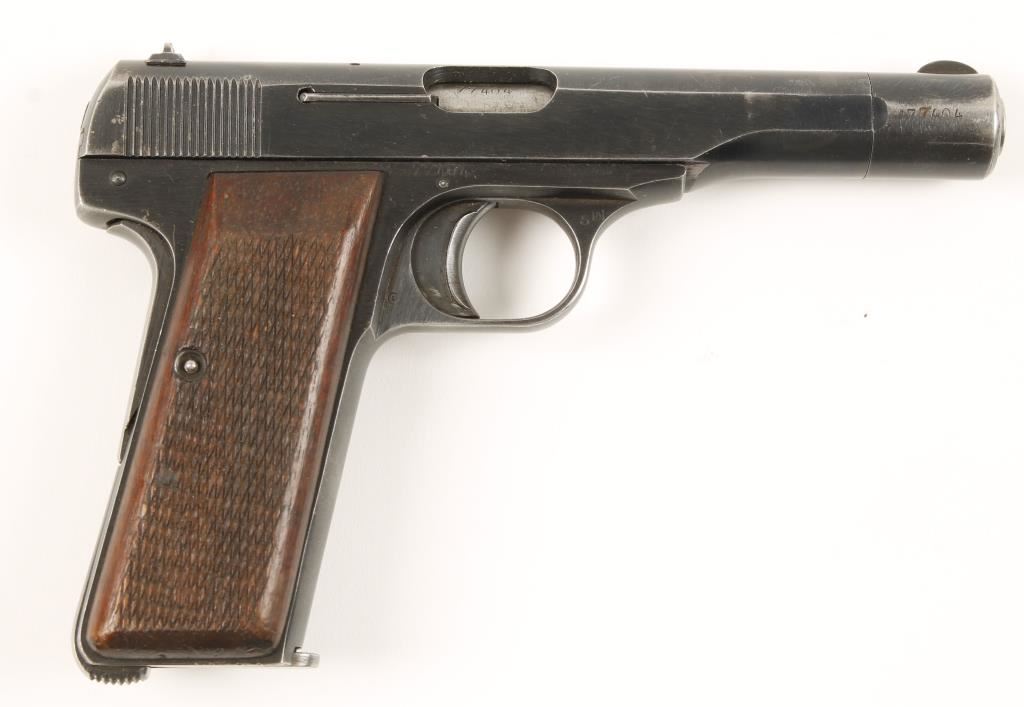 Blued single-action hammerless semi-automatic pistol with a 4-1/2" barrel and one magazine. Made during the Second World War for the occupying Nazi troops (many waffenamts). All serial numbers match. Finish is brushed steel with bluing wear to high points, grip straps and edges. There are very few small dings or scratches. Bore is bright and shiny. Action is very good. Checkered wood grips are in good condition. Condition is very good. *Modern Firearm*