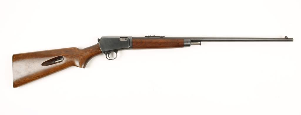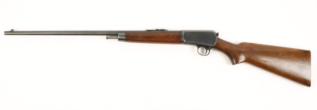 Semi-auto takedown re-conditioned rimfire (Super speed & Super X) rifle. Blued 22-1/2" unmarred barrel. Bore is un-pitted but dark and rifling looks worn. Non-checkered plain pistol grip stock and fore grip showing heavy with deep scratches on left of the stock. Receiver and action appear to be in good working order Stock-fed tubular 10 rd. magazine. Charging rod looks to be in original condition. Overall condition is Good. Modern Firearm
