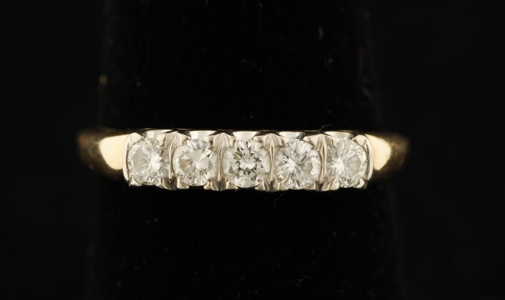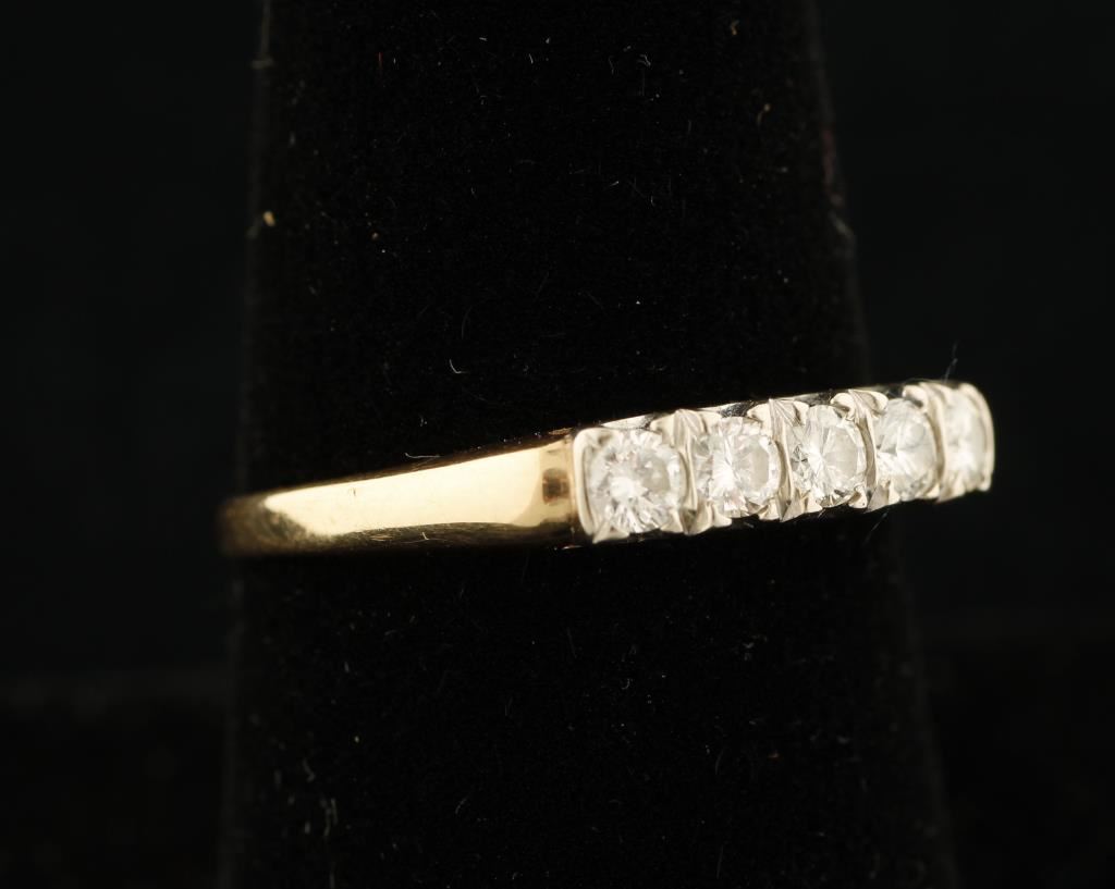 Splendid vintage diamond ring with 5 round cut diamonds weighing approximately 0.30 total with G-H color and SI clarity set in both yellow and white 14kt gold (tested positive for 14K on gemOro and JSP gold acid test kit). Ring is size 8.