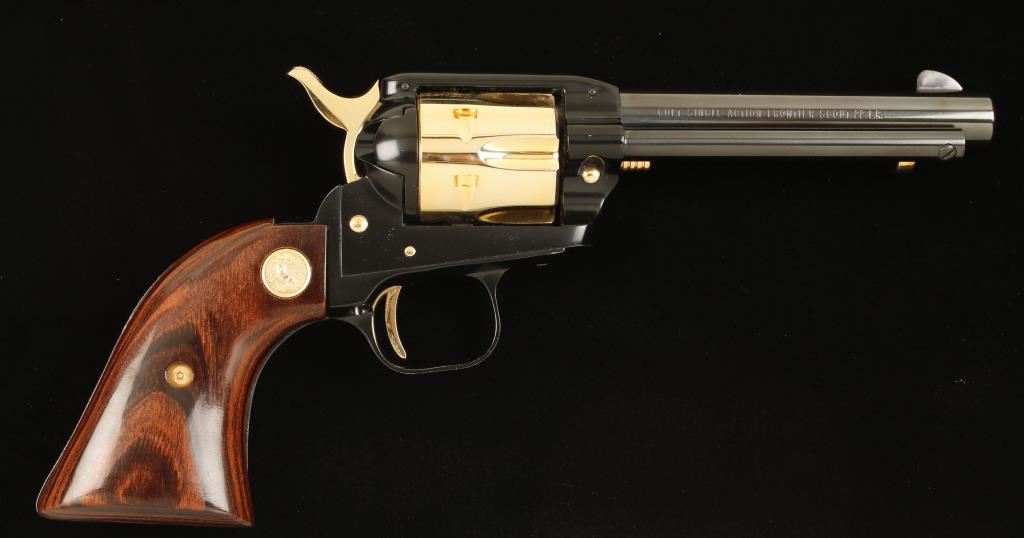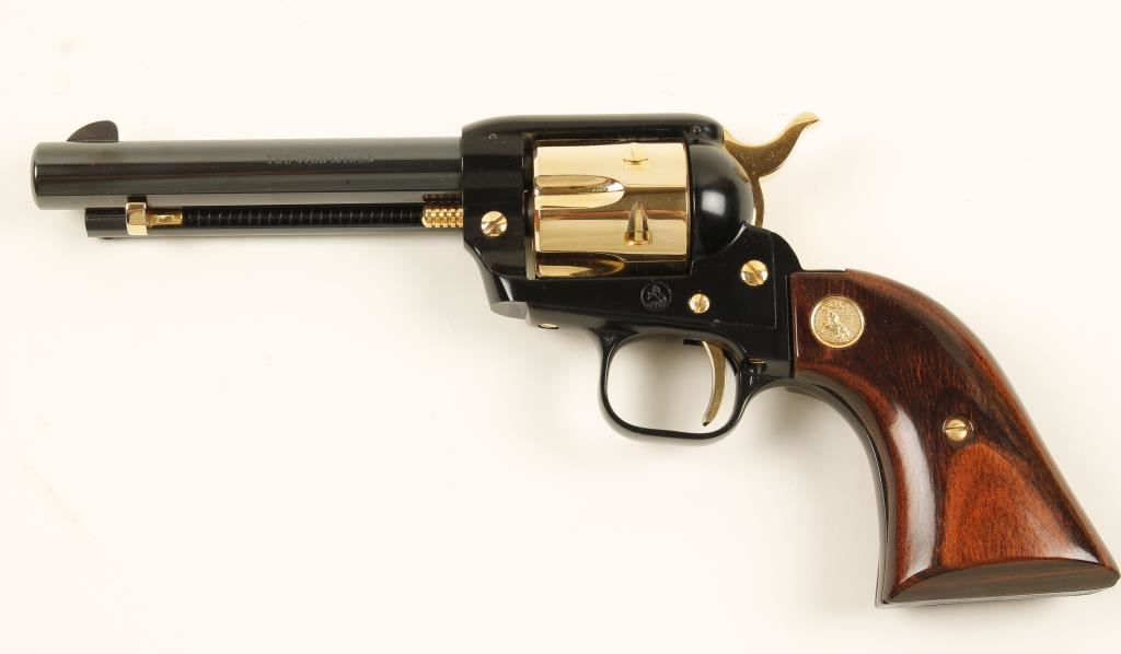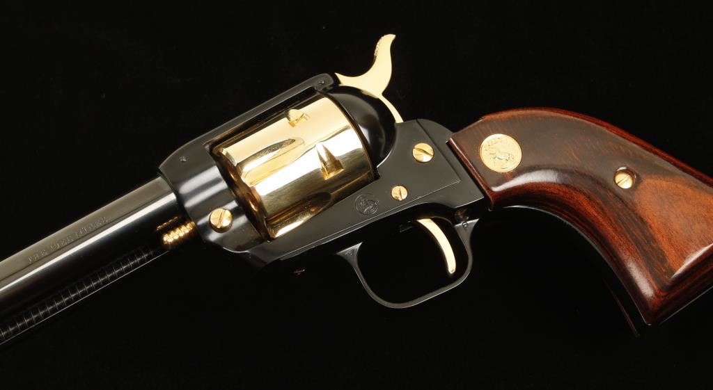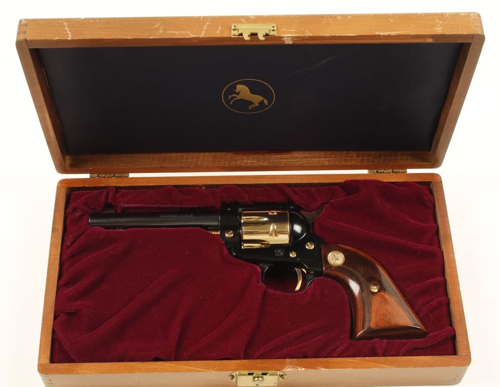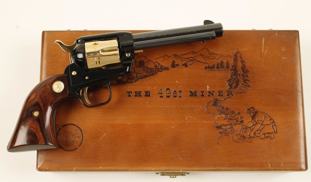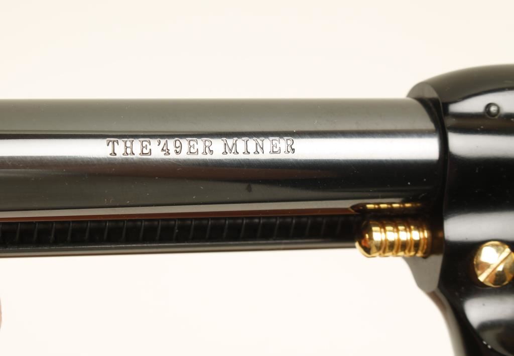 Cased commemorative for "The 49er Miner". Blued high polish steel, black high polish alloy, and gold plated steel single-action 6-shot revolver with a 4-3/4" barrel. Finish is immaculate. Bore appears to be pristine. Chambers are clear of any deficiencies. Wood grips are poor fitting but in excellent condition. Action was not tested as this may never have had the cylinder turned. Hardwood box has a French style form-fitting burgundy velvet lining. The box has a pressed prospector motif on the exterior of the lid. No key. There are many scratches, scrapes and dings on the box. Condition is excellent. *Modern Firearm*