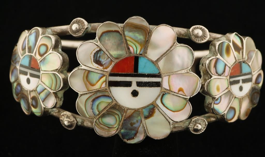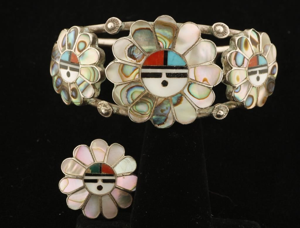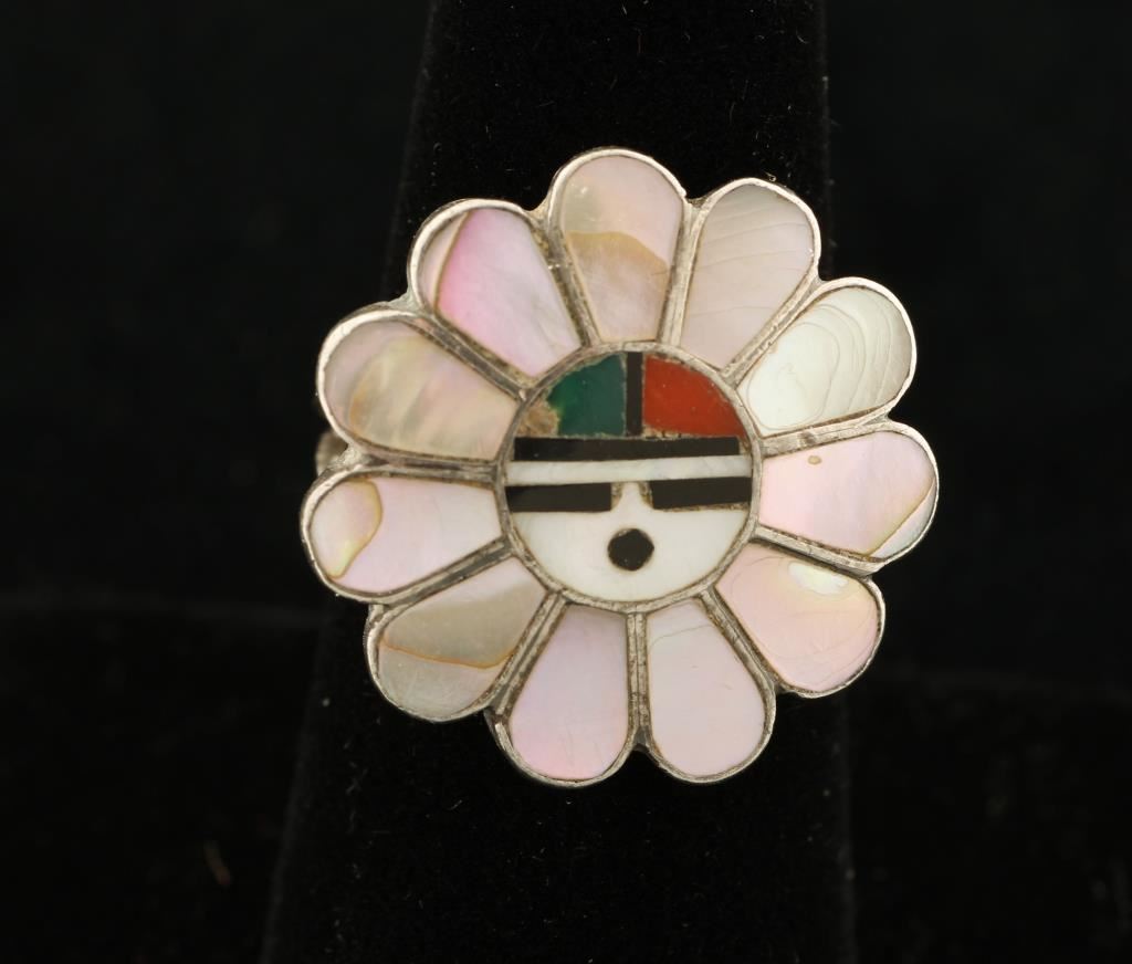 Zuni artists Sadie and Morris Laahte are a well known husband and wife team who started making jewelry in the 1970s. They specialize in channel and mosaic inlay. Their favorite design is the revered Sunface. The Sun is the bringer of life, stability and continuity bringing prosperity and joy to families. The Sunfaces in this jewelry are made of abalone shell, turquoise, onyx, coral, and mother-of-pearl. Both pieces have the Laahte's sunface hallmark. The ring is size 7.