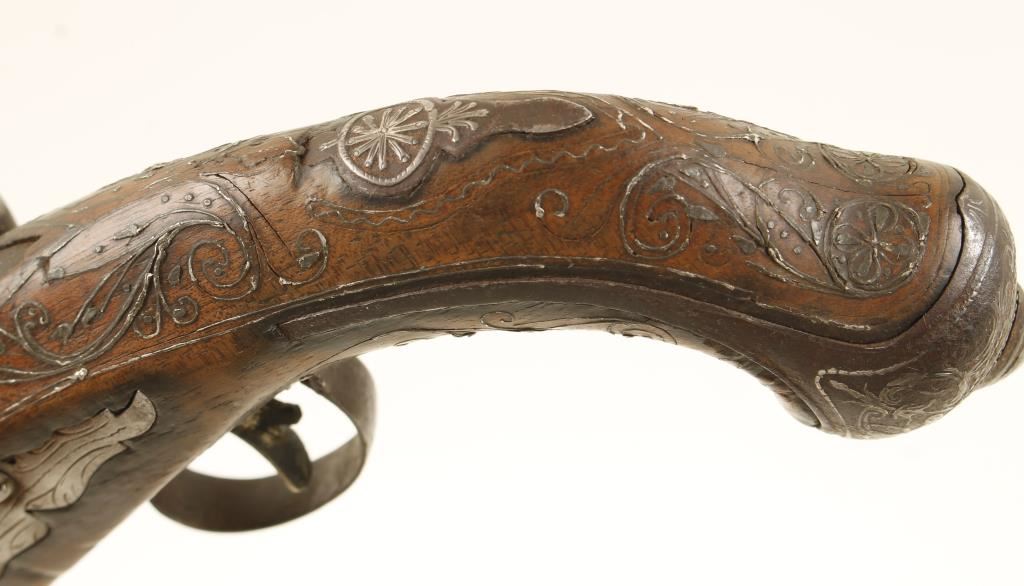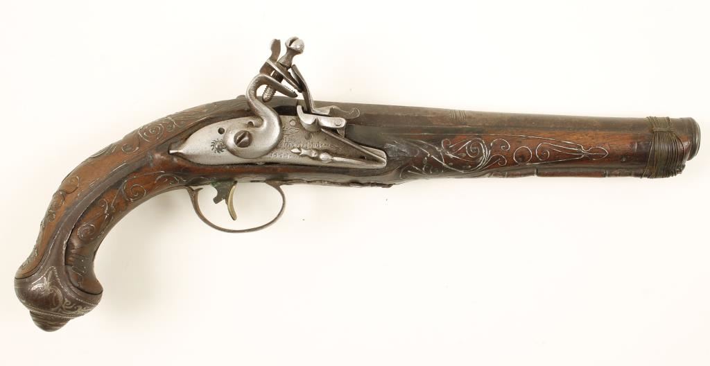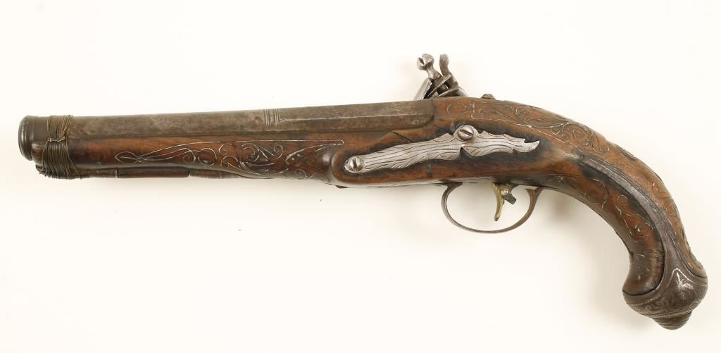 Pirate style pistol with a 7" swamped part-octagon barrel. Steel is primarily a brown patina with rounded edges and rust stains. lock plate, hammer, frizzen and pan are all in-the-white with some roughness/pitting. A white colored metal wire has been inlaid into the grip cap and wood stock. There is a foreign language text engraved on the top of the barrel. There is some rudimentary engraving on the trigger guard, side plate and lock plate. The stock is held to the barrel with wire wrapping. The stock is in poor shape with cracks, missing chips and shrinking/warping away from metal. Barrel is a smoothbore with heavy pitting. Action works. No flint is installed. Condition is poor. *Antique Firearm*