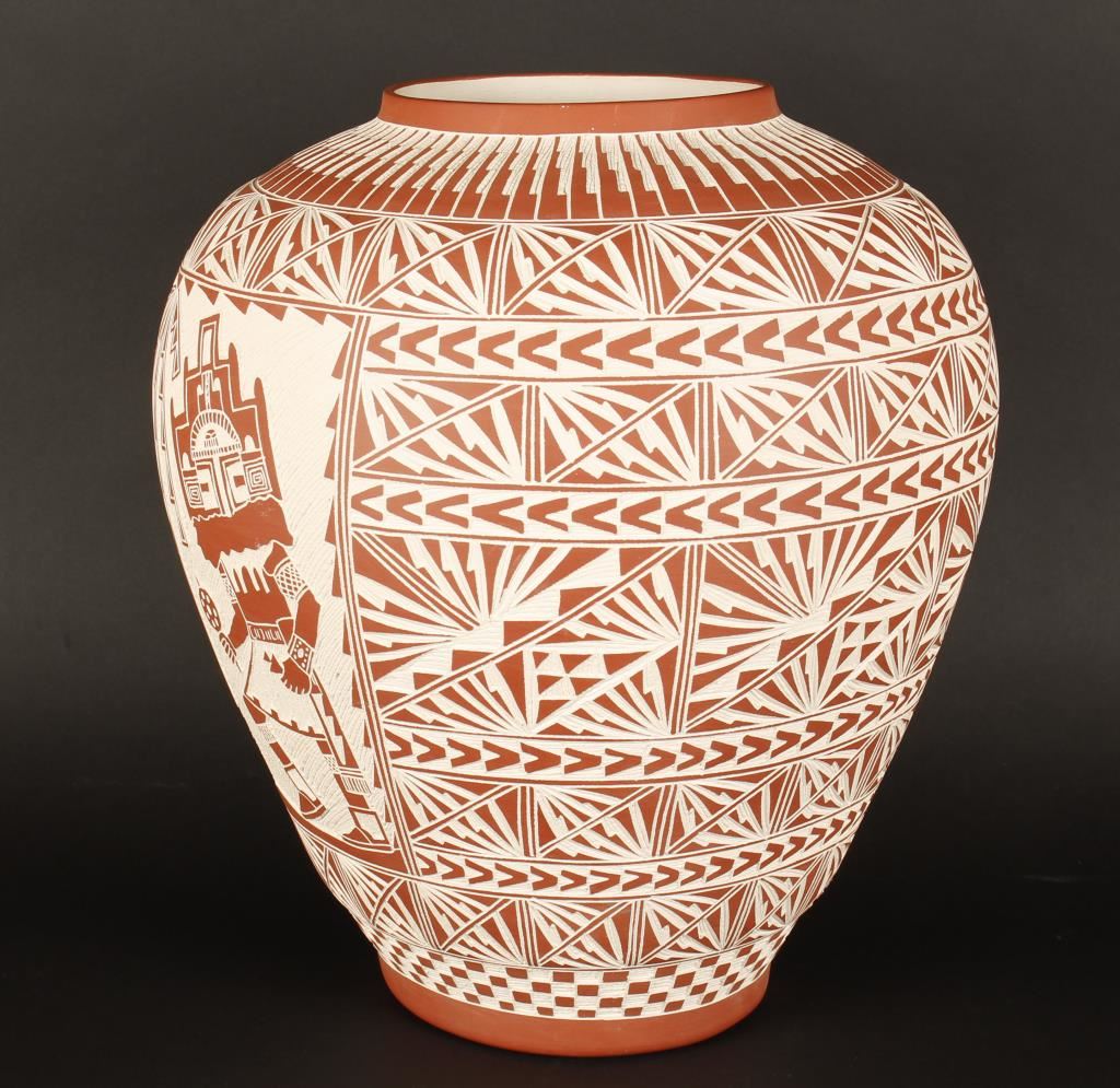 Lot 686 Acoma Incised Carved Pot with Kachina Decoration.