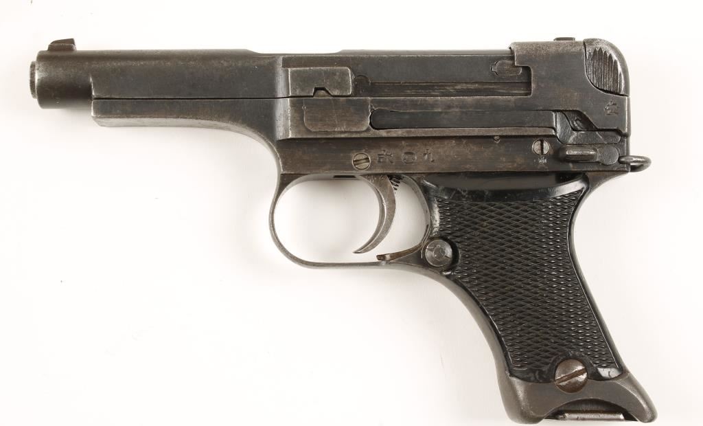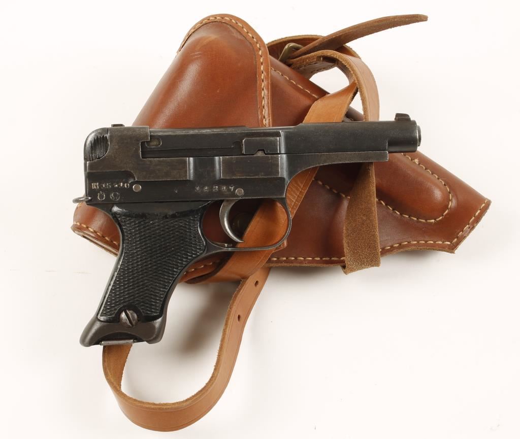 Blued single-action semi-automatic hammerless pistol with a 4" barrel and one magazine. Made in October, 1940. The finish is dull with areas of pin prick pitting. The magazine number is matching the pistol serial number. Action works well. Bore is shiny with good rifling. Black plastic grips are a little loose and have some scratches with one tiny flake missing from the left grip. Includes an aftermarket leather holster. Condition is good. *Modern Firearm*