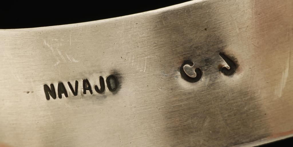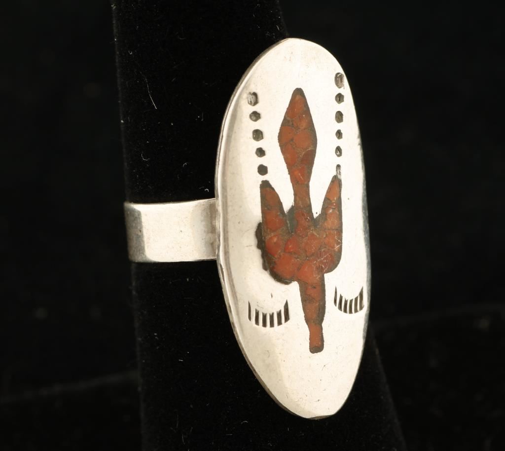 A heavy cuff and ring by Navajo artist Corbet Joe who is known for his chip inlay. Both the cuff and ring feature the peyote/water bird. The Peyote bird is connected to thunder and lightning. The cuff also has lightning symbols thus the connection to the peyote bird. The cuff is for a smaller wrist having an inside measurement of 5" plus a 1 1/4" gap. the cuff is hallmarked 'CJ Navajo' and weighs 47 grams. The ring is marked 'CJ' and is a size 6.