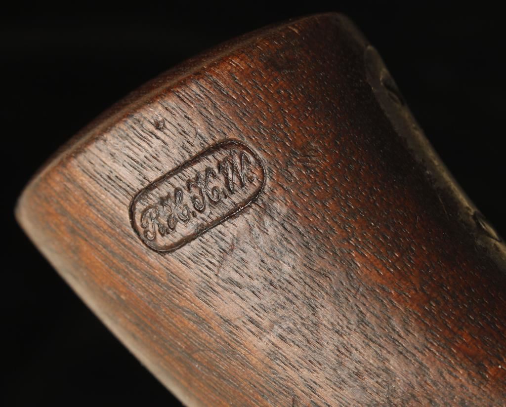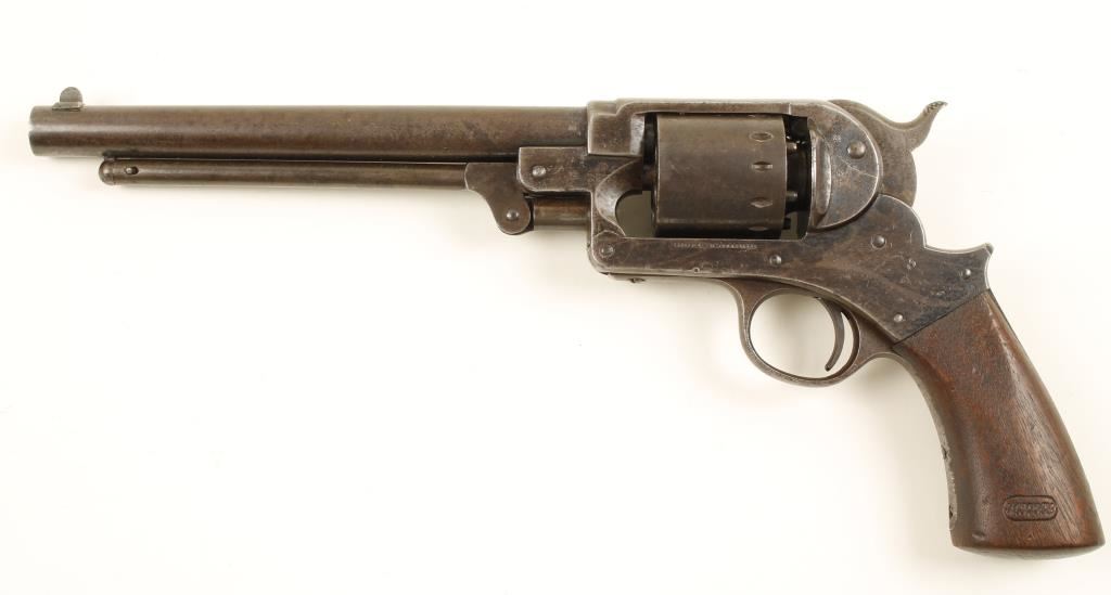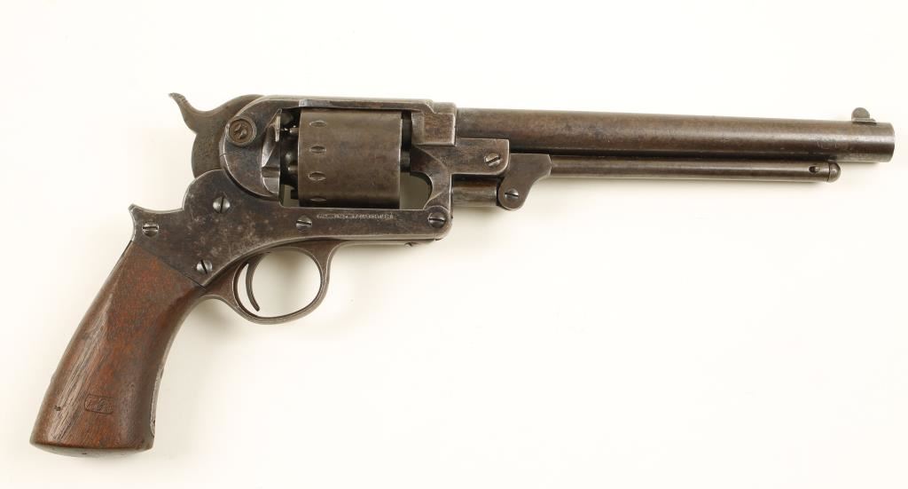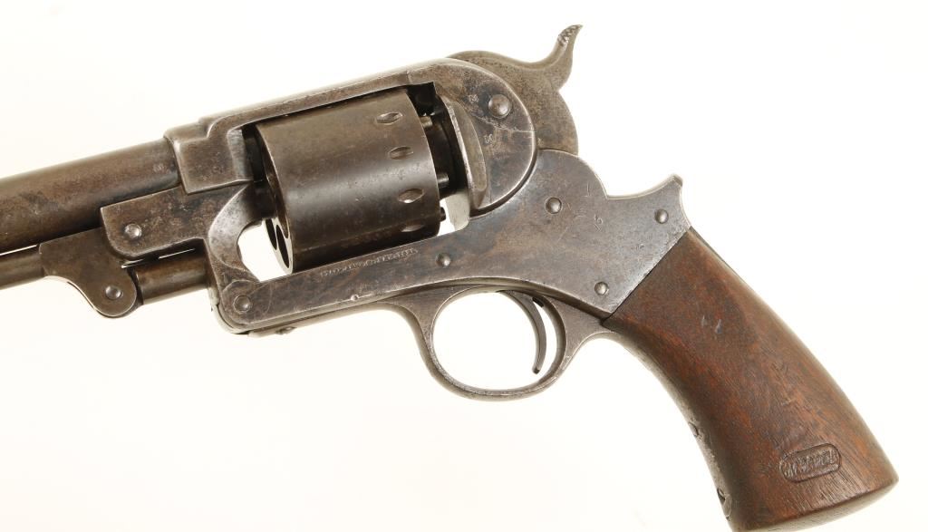 Blued single-action 6-shot percussion top-break revolver with an 8" barrel. Has inspection stamps "M" (on barrel, upper frame, cylinder and lower frame) and "B" (on trigger guard/grip frame). Finish has turned to grey/brown patina. There are small dings and scratches with small areas of pitting. Nipples are in good shape. The bore is shiny with strong rifling. Stamped "Starr Arms Co. New York" on the left and "Starr's Patent" (with an illegible date) on the right. Grip is in good shape with a few dings and cartouches. Upside down "RHKW" on left side and "BH" (?) on the right. Functions well with good lock-up. Condition is very good. *Antique Firearm*
