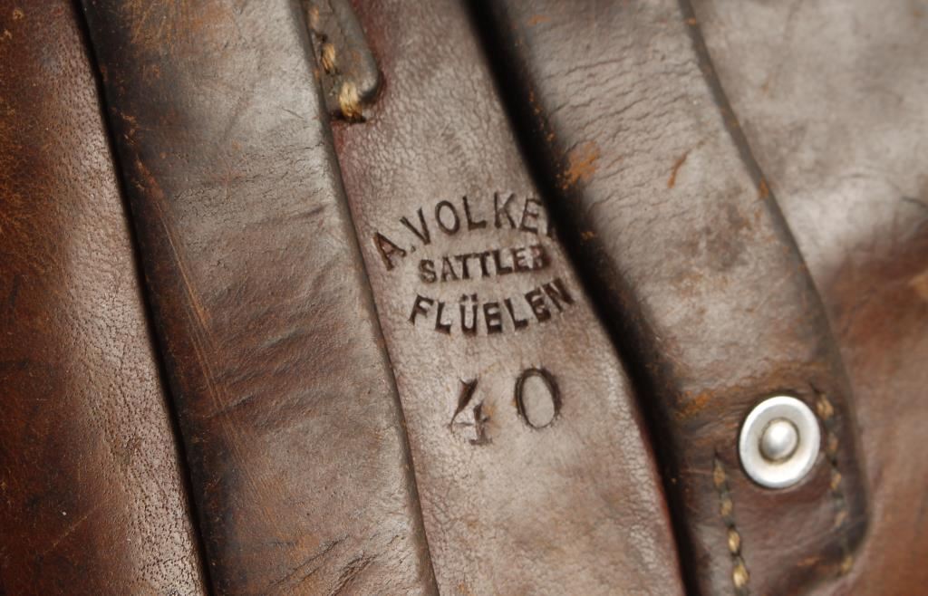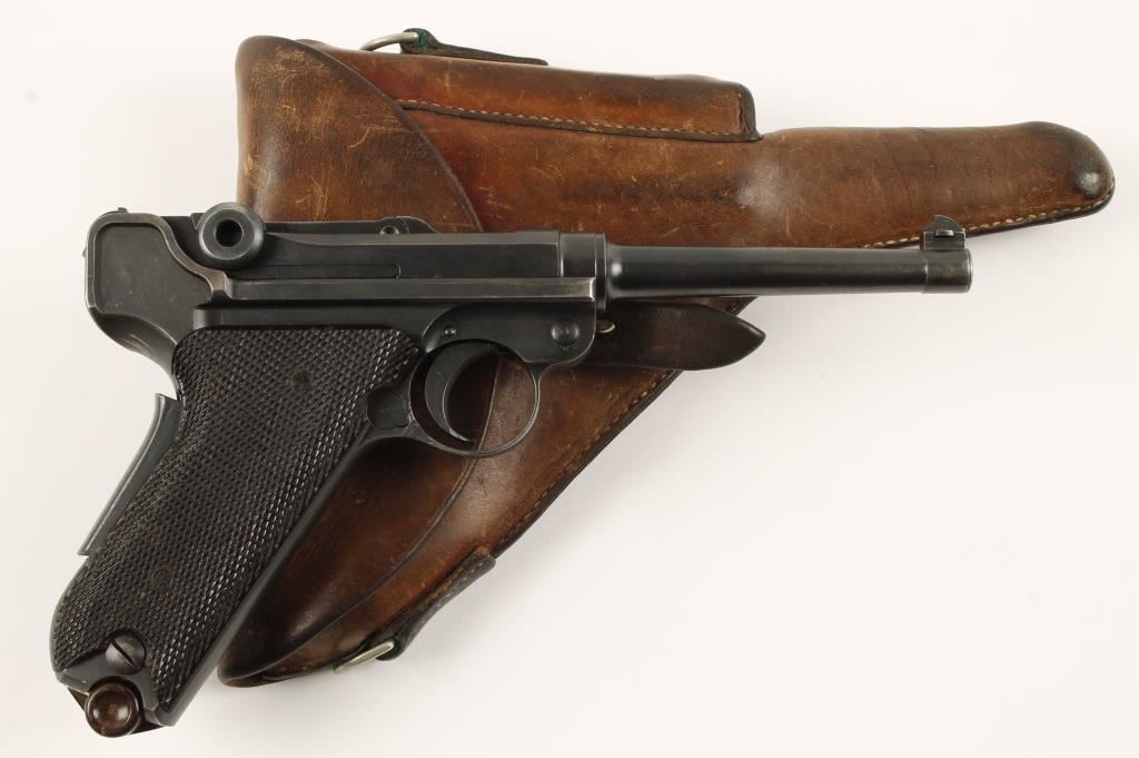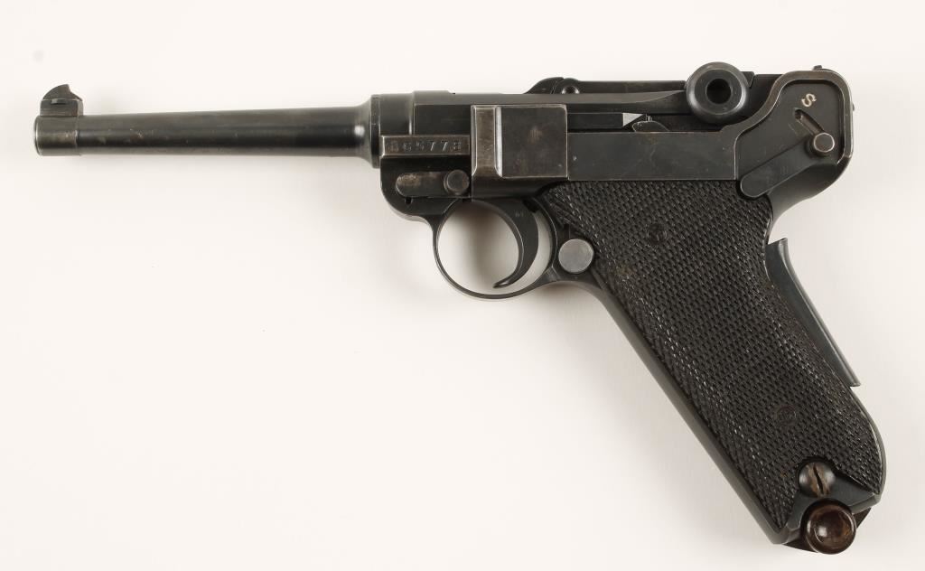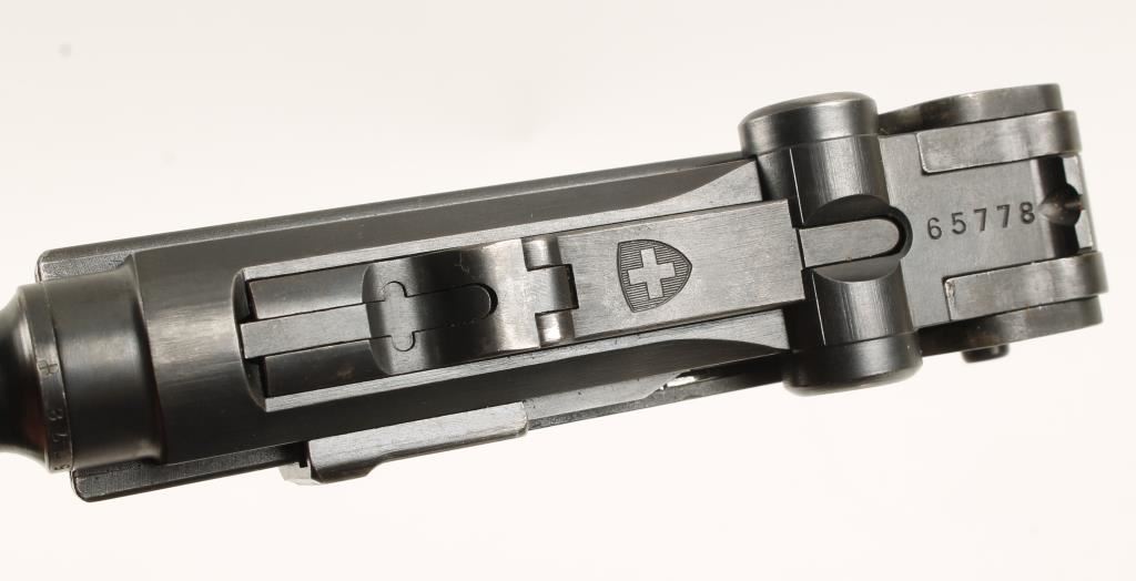 Made in Switzerland at Waffenfabrik Bern. Blued single-action semi-automatic hammerless pistol. Has Swiss shield on front toggle link and Swiss military proof below the rear link on the frame. Toggle grips are not checkered. The bore is bright and shiny. The finish is light wear to the edges and exposed areas. The grips are black plastic and are in very good condition although slightly over sized for the frame The serial numbers match between the frame, barrel, barrel extension and side plate. All other small parts are marked with the Swiss cross. The action is flawless. Includes flap holster and two magazines. Holster is supple and stamped "A. Volken Sattler Fluelen 40". Condition is very good. *Modern Firearm*