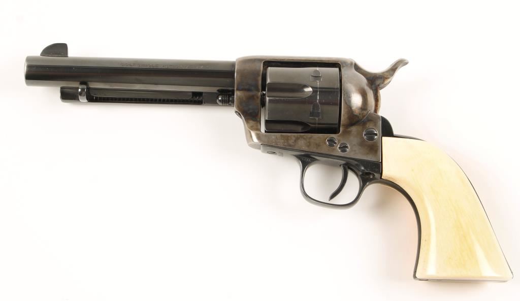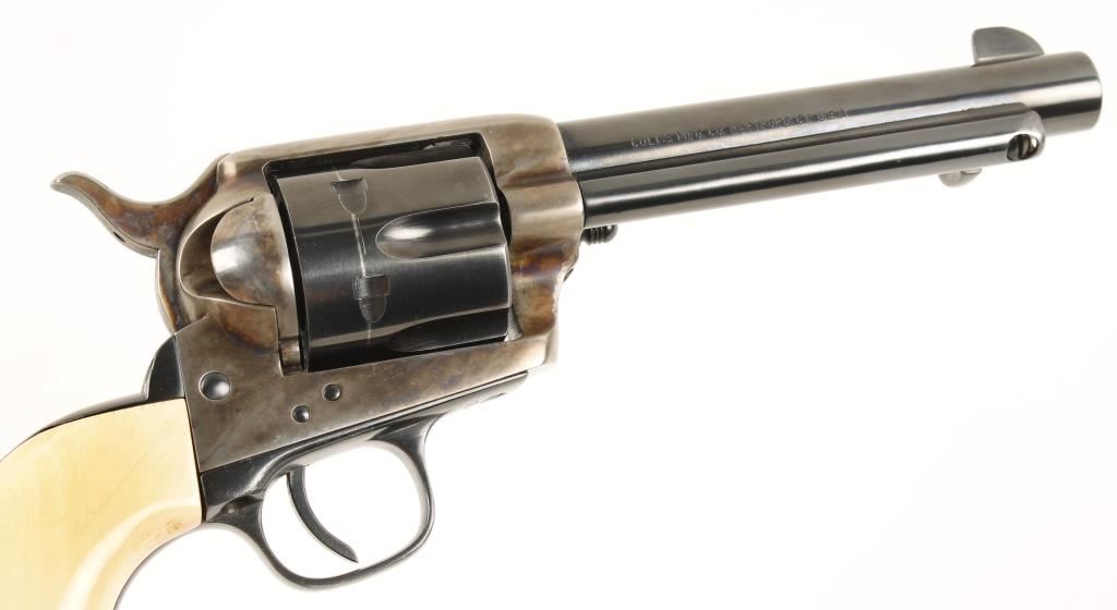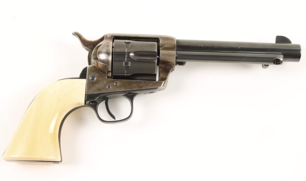 Made in 1882. Re-blued and case-colored single-action 6-shot revolver with a 5-1/2" barrel and ivory grips. Finish has a drag lined and light edge wear. Case-colored frame has good color in protected areas. Re-finish has caused some of the roll-stampings to go away. Stamped "US" on left side of the frame. Ivory grips are very well-fitted and one has spider web cracks on the bottom. Bore and chambers appear to be shiny and the rifling is visible with edges. Condition is very good. *Antique Firearm*