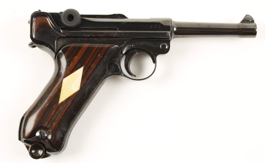 Blued single-action semi-automatic hammerless pistol with a 4" barrel. Bright polish refinish with some freckling. Custom grips of straight grained hardwood with inlaid diamonds. They are starting to lose their finish. All the numbers match (including the hold-open, firing pin, breech block, trigger, safety, safety lever and trigger bar) except for the mismatched side plate. The bore is not shiny but it is bright and has sharp rifling. Action is good. The magazine has been jewelled. Condition is very good as refinished. *Modern Firearm*