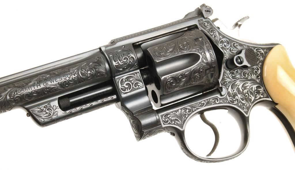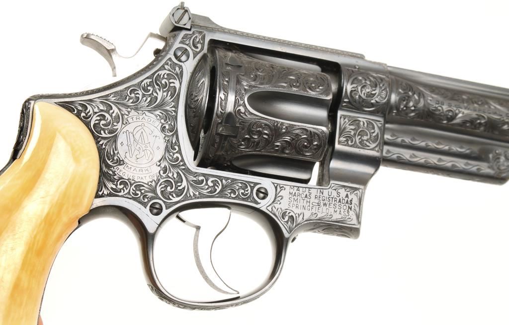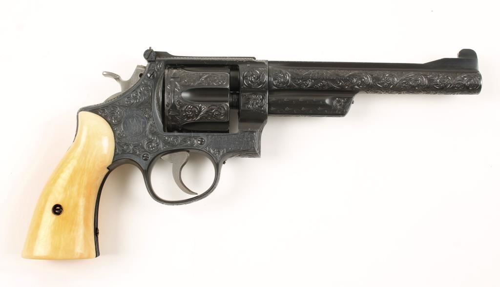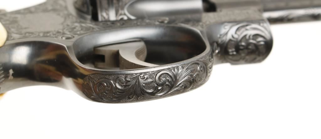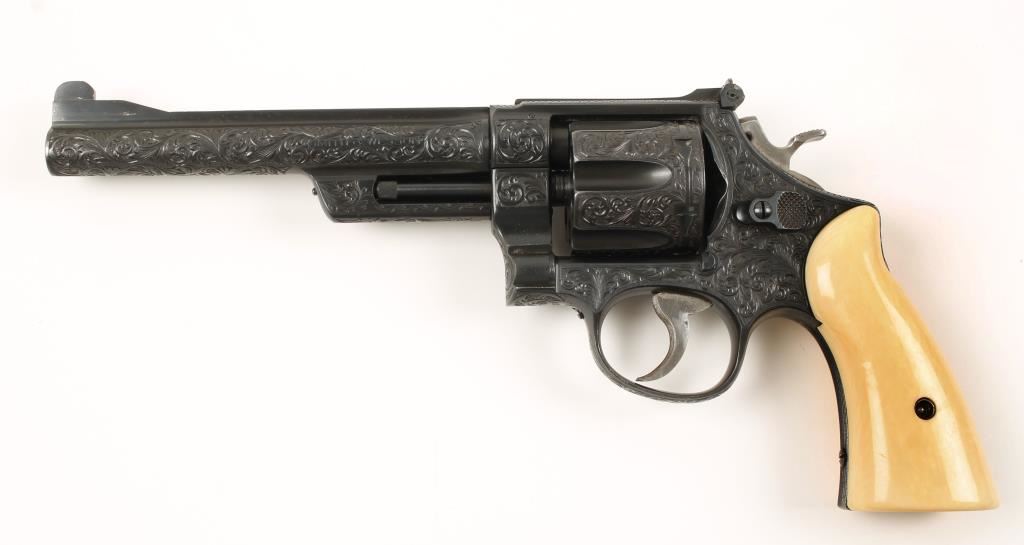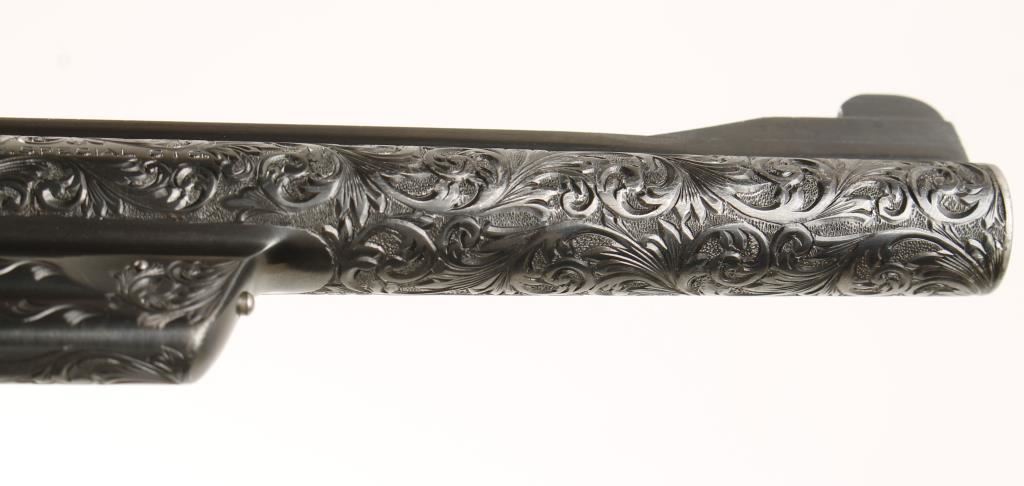Model of 1950. Factory engraved. Blued double-action 6-shot target revolver with a 6-1/2" barrel with a top rib. Adjustable rear sight. Almost full-coverage engraving in the style of R.J. Kornbrath. The grip frame under the left grip panel is stamped "R. J. Kornbrath" although he died in 1946 after suffering a debilitating stroke in 1937. The finish has a slight drag line. Has a checkered hammer with a .400" wide spur. Serrated trigger and grip straps. Bore and chambers are shiny and there is sharp rifling. Ivory grips in good condition with small grips between them and the frame. Condition is excellent. *Modern Firearm*