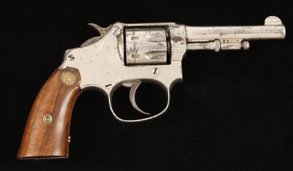 Nickel plated 3rd model double-action M-frame 7-shot revolver with a 3' barrel. Finish is worn and flaked off with bubbling, surface rust and pitting. There is a drag line. Bore is grey with pitting and rifling. Chambers are pitted. Smooth walnut grips with medallions are complete with dings and rubs. Does not function well. Condition is poor to fair. *Modern Firearm*