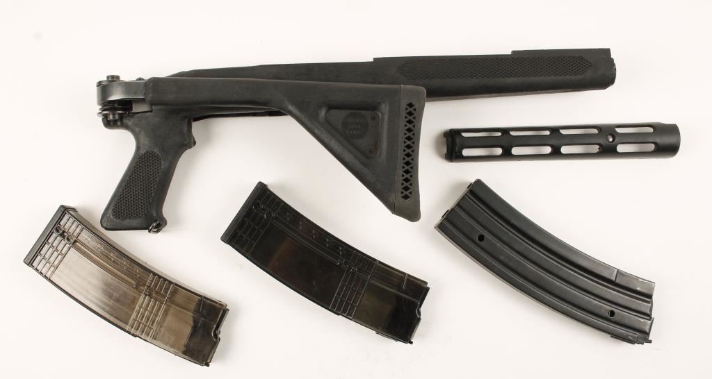 Made by Choate. Comes with ventilated hand guard. Has blued steel hinge hardware and sling swivels. Includes 3 mags, two Eagle brand plastic mags (35-round) and one unmarked steel 40-round magazine.