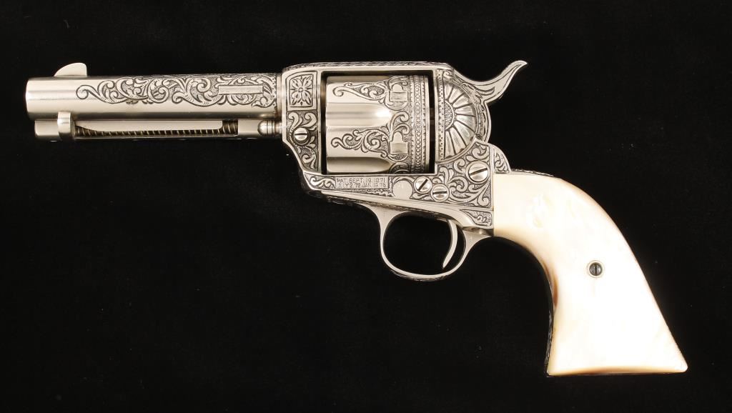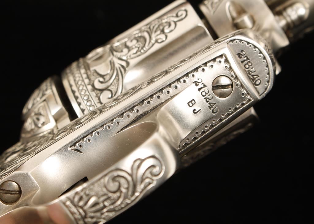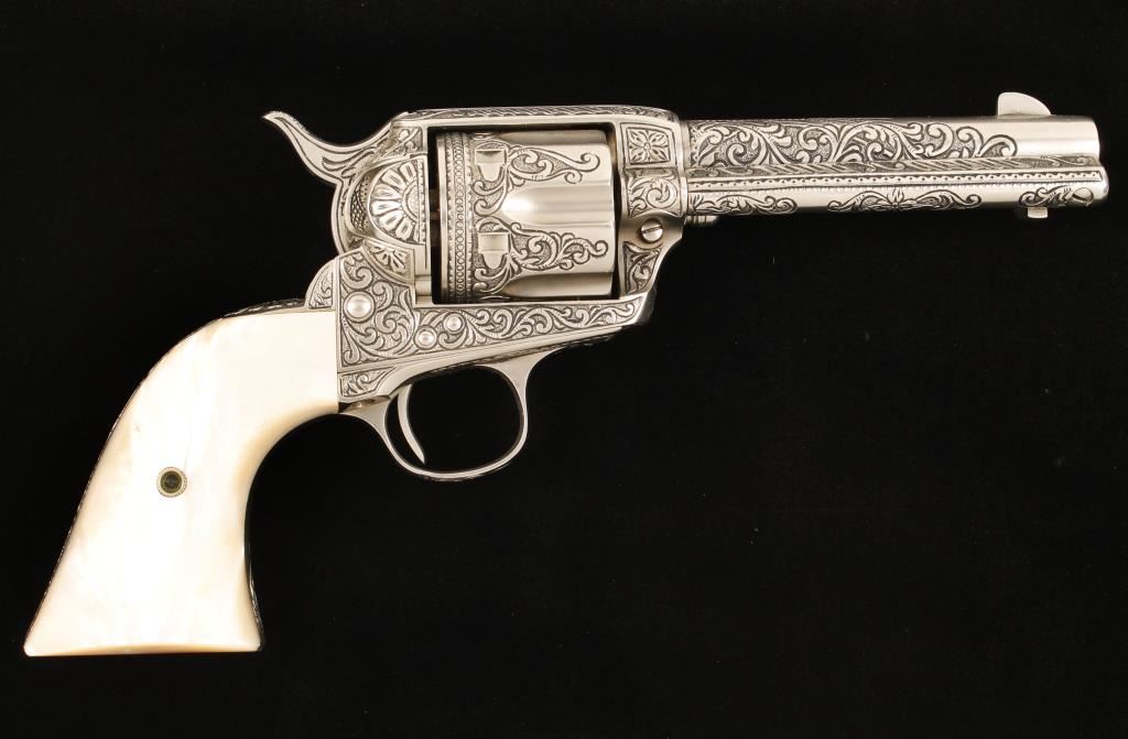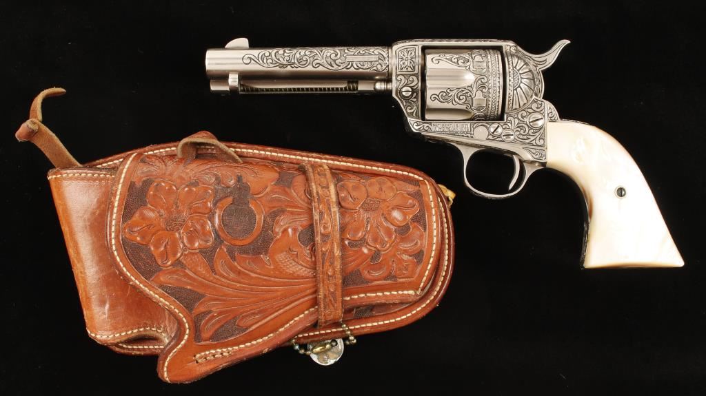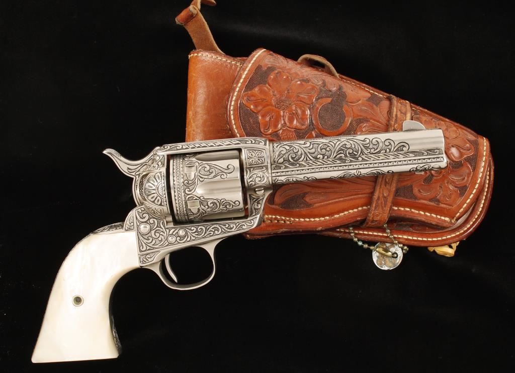 In-the-white(?) single-action 6-shot revolver with a 4-3/4" barrel that has been very deeply engraved by Bill Johns and is accompanied by an ornately tooled holster by noted leathersmith Edward Bohlin of Hollywood, CA. Made in 1906. Finish is close to full coverage engraving done by master engraver Bill johns of Cody, Wyoming with scrollwork, stippling and tasteful borders and his initials "BJ" in front of the trigger guard. The bore and chambers are in good condition. The grips are mother-of-pearl with no deficiencies. The leather holster is a single loop with floral tooling marked "EDW. H. BOHLIN. INC. MAKER HOLLYWOOD, CAL. that has a spring tensioned hammer spur loop. Condition for all is excellent. *Modern Firearm*