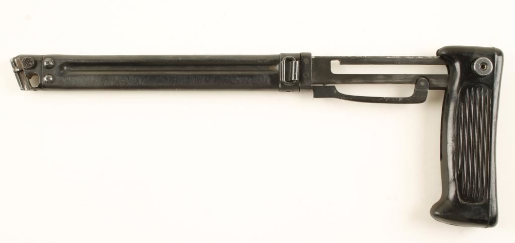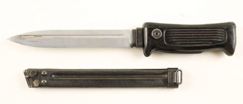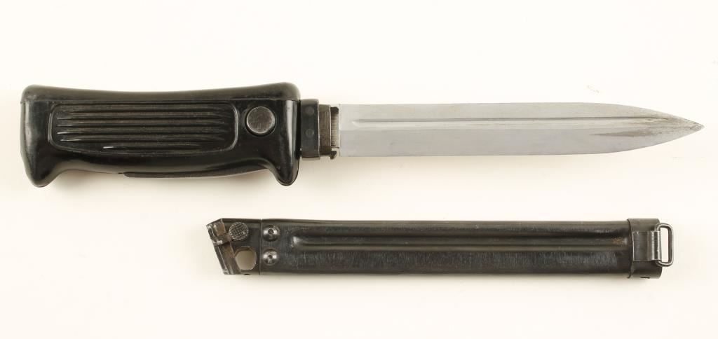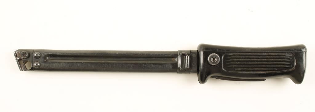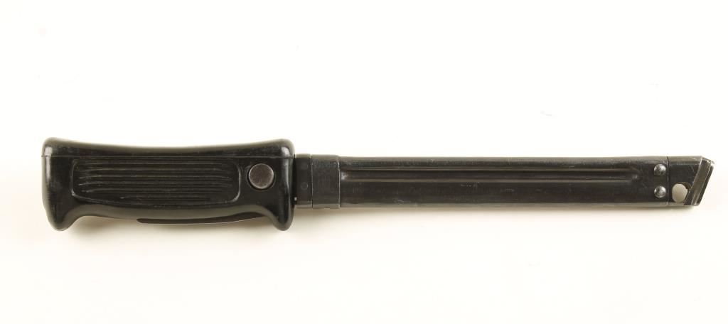 For the Chinese Type 80 Machine Pistol. Plastic grip can be pulled straight out for using the knife, or the button can be pressed and the plastic grip can be pulled back and rotated down and be used as the butt plate for the stock. The front end of the scabbard has a "T" that will fit into a corresponding slot on the backstrap of the pistol. Condition is very good.