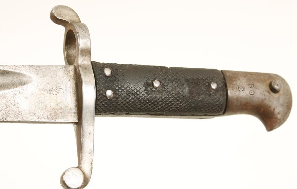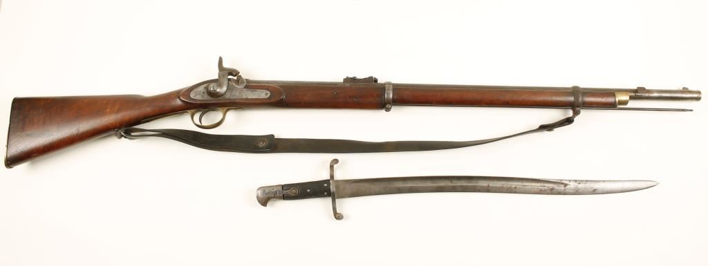 Blued muzzle-loading percussion rifle with a 32" barrel. Has a bayonet made by Weyersberg, Kirschbaum & Co. of Solingen, Germany with a Yataghan blade and pressed leather scales. There is no scabbard. Bluing has turned to a brown patina with pitting. Brass trigger guard and buttplate have dings and scratches. Lock plate reads "Tower 1867" with queens crown. Bore has dull shine with pitting and fair rifling. Action works. Wood stock has sustained some minor damage but less than I would expect. Condition is very good. *Antique Firearm*