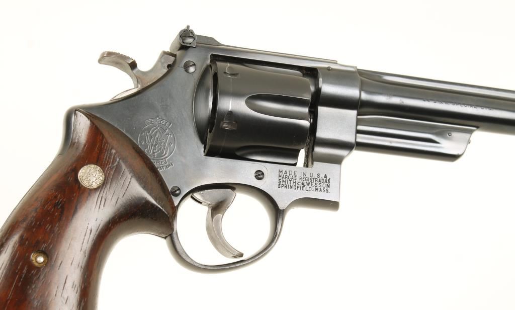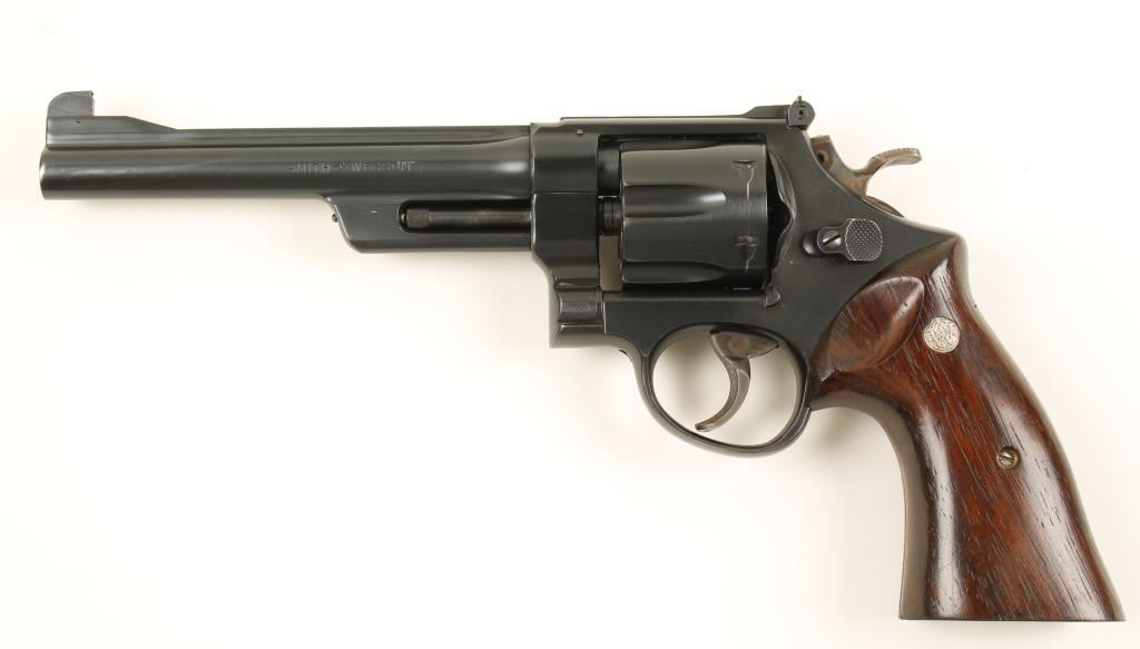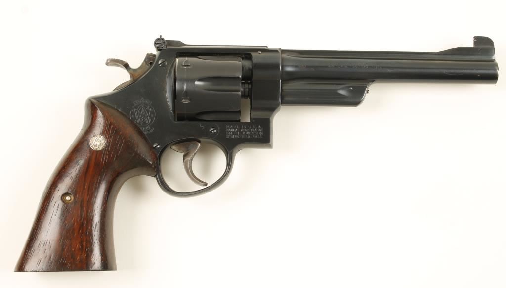 Blued double-action 6-shot target revolver with a 6-1/2" barrel that has a full length top rib, adjustable rear sight and Patridge front sight. Pre-Model 24. The finish has light edge wear with a drag line. The back strap is serrated. The target hammer and trigger retain bright case coloring. The bore is mirror bright with strong rifling and the chambers are shiny. The function is impeccable. The wood target grips have a few dings. Condition is excellent. *Modern Firearm*