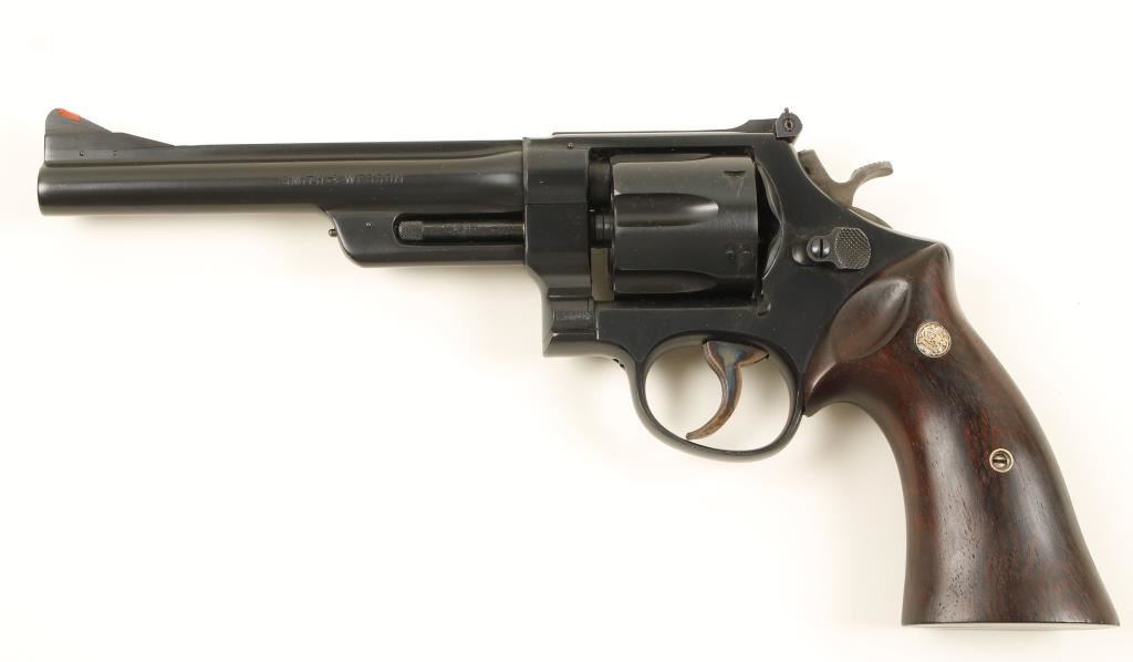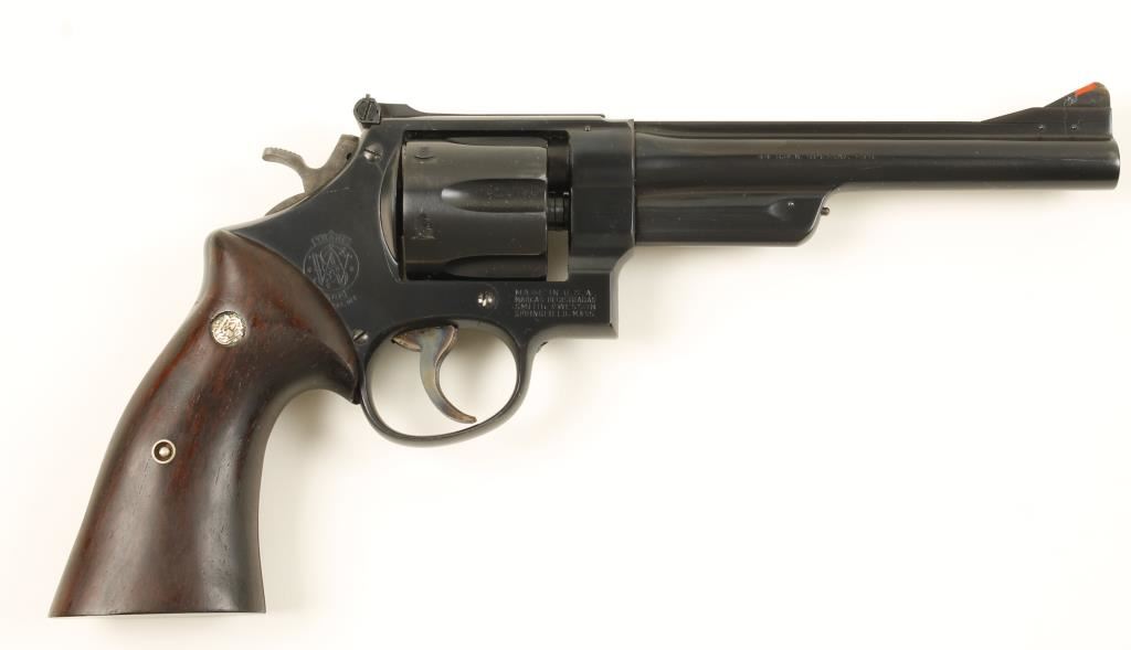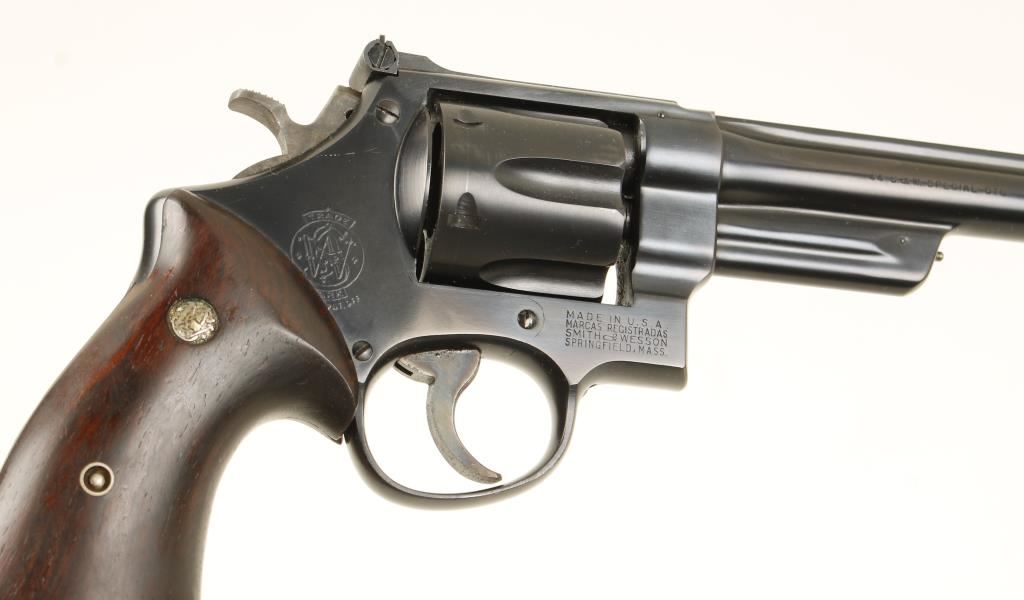 Blued double-action 6-shot target revolver with a 6-1/2" barrel with a full top rib. Fourth Model Hand Ejector. The finish is near perfect with only a slight drag line showing the cylinder has been turned. The hammer and trigger retain bright case-coloring. There is an adjustable rear sight with a front ramp sight that accepts inserts. The back strap is serrated. The bore is mirror bright with strong rifling. The plain wood target grips have medallions and a few scratches and dings. Condition is excellent. *Modern Firearm*