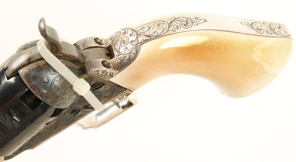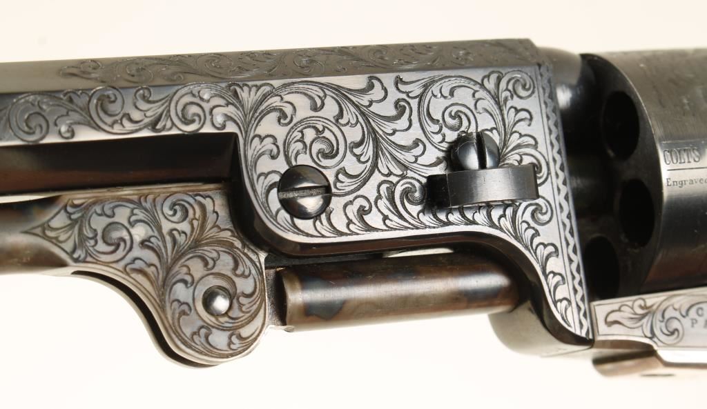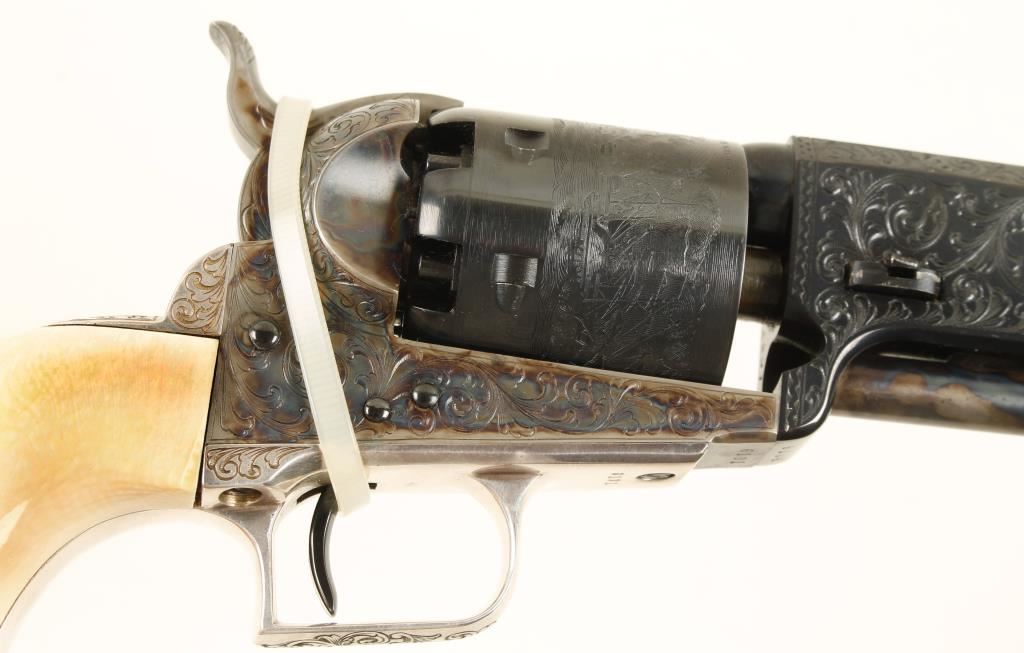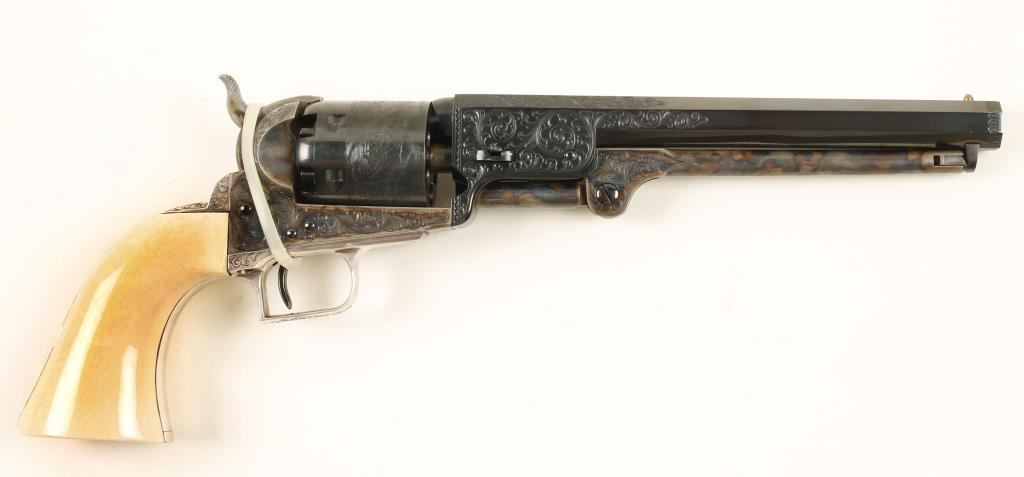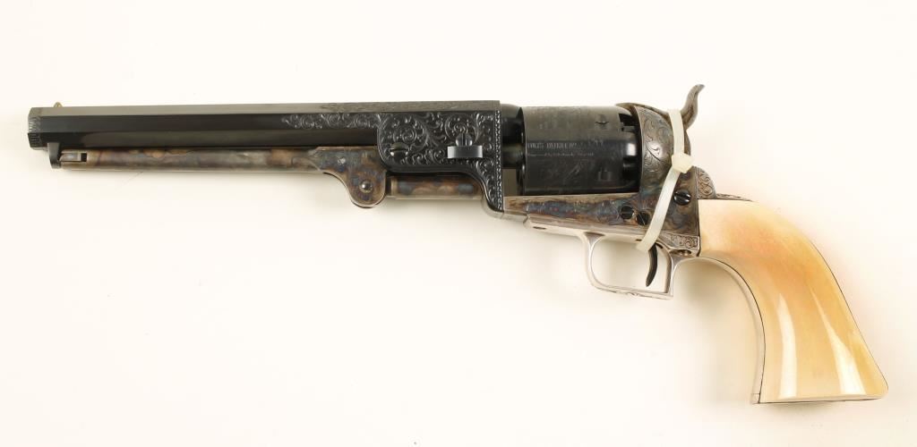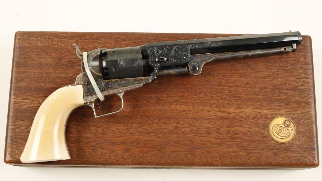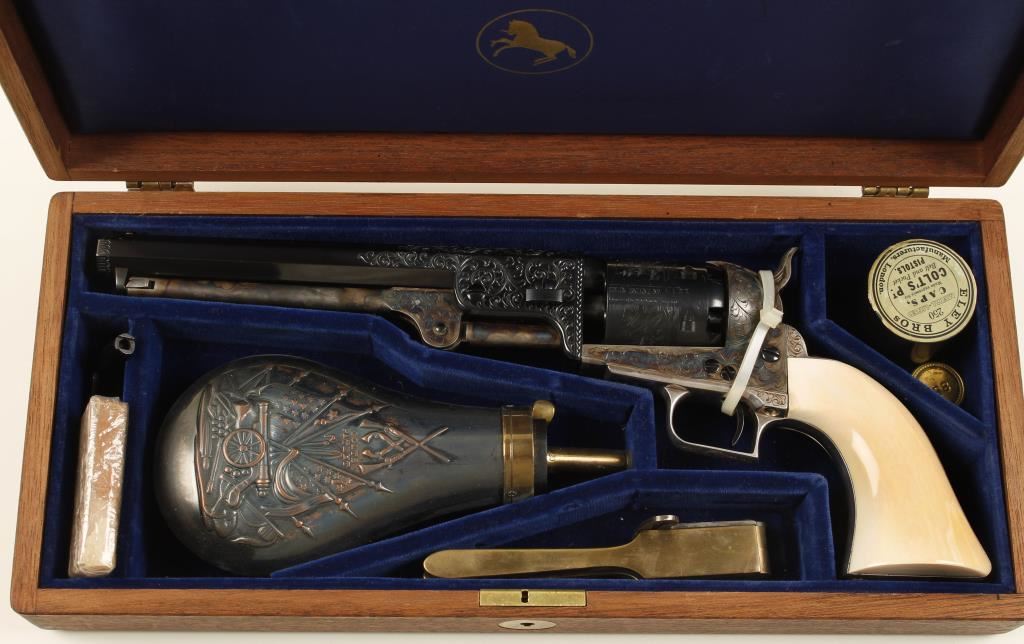Cased single-action 6-shot percussion revolver with a 7-1/2" octagon barrel and tools. 2nd generation. Stamped Colt's Patent. Finish is immaculate. Engraved blued barrel and cylinder. Case colored engraved loading lever, hammer and frame. Plated and engraved non-ferrous trigger guard and backstrap. Ivory one piece grip. Once owned by Colt Navy collector John Woodward. Includes case with powder flask, bullet mold, nipple wrench, package for antique cartridges, and cap tin (with some balls in it). Wood case has a velvet and satin lining with a Colt logo medallion on the outside of the lid. Condition is fine. *Antique Firearm*