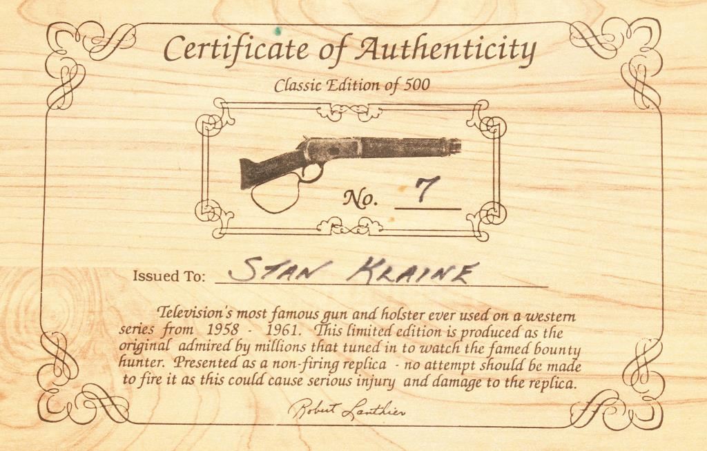 "Mares Leg" saddle ring carbine cut down to resemble Steve McQueen's famous gun used in "Wanted Dead or Alive". (Non gun, non firing, plugged bbl). Includes certificate of authenticity #7 of 500 issued to Stan Klaine. In fair overall condition with little to no finish remaining.