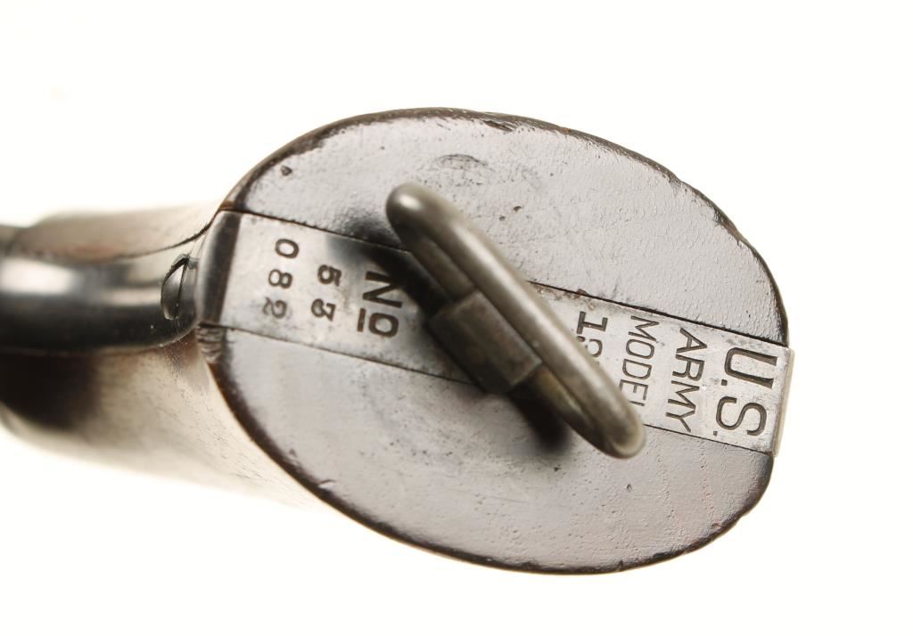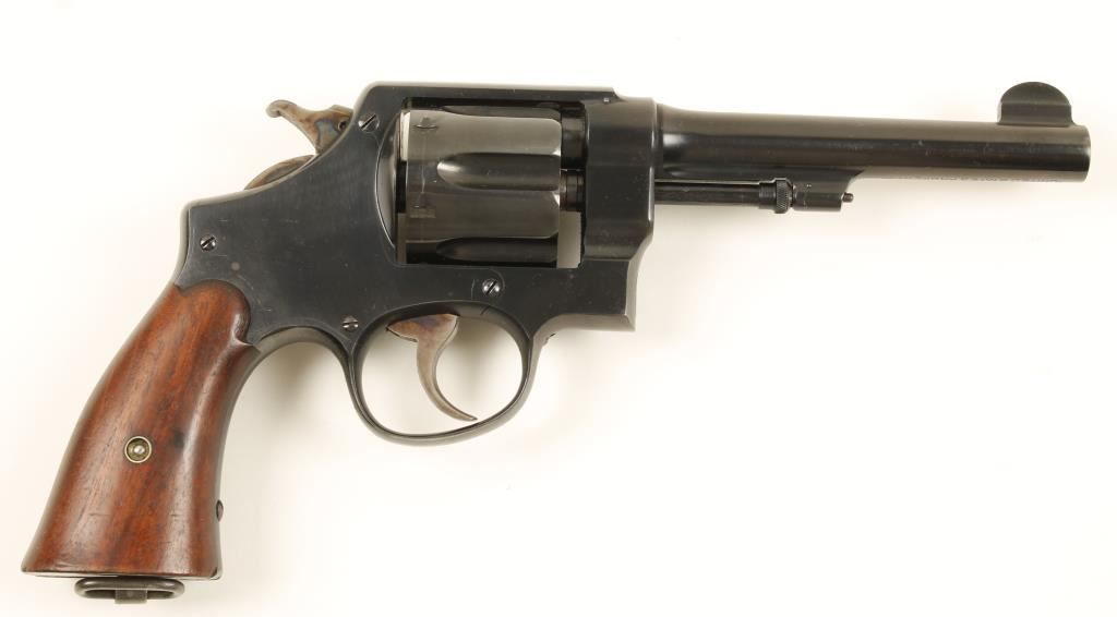 Blued double-action 6-shot revolver with a 5-1/2" barrel. Probably in original bluing and it is believed to be unfired. There is a slight drag line. All the roll-stamping is very sharp. Stamped "U.S. Army Model 1917" on the butt, "United States Property" on the bottom of the barrel, and the "flaming bomb" ordnance mark is behind the recoil shield. The hammer and trigger still have bright color case hardening. The bore and the chambers are shiny and the rifling is sharp. The plain wood grips have some minor dings, a scratch and a tiny chip out of the corner. Condition is excellent. *Modern Firearm*