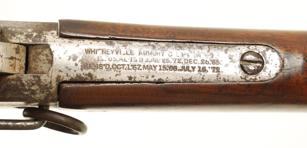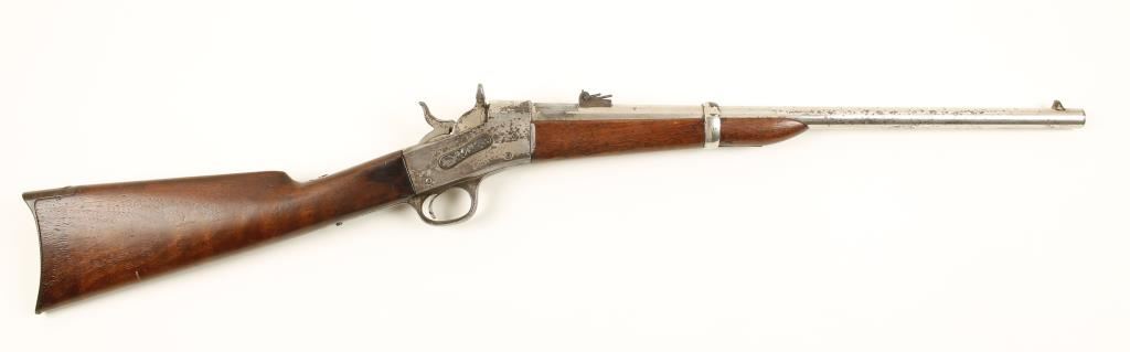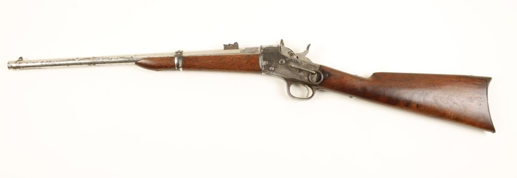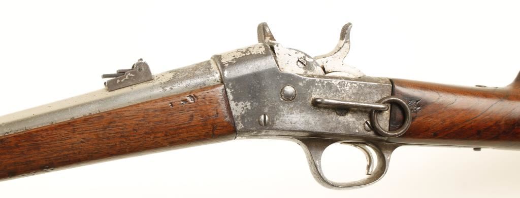 SN: 17632 Nickeled saddle-ring rolling-block with a 20-1/2" barrel. Plating has perhaps 40% coverage on barrel and receiver with the exposed metal turning to a pitted brown patina. Buttplate is almost all steel with patina surface. Rear sight is 3-leaf. Wood has chips, dings and scratches. Bore has sharp rifling with spots of corrosion and pitting. Rare and improved action allows opening of the breech on half-cock. It works well. Condition is fair to good. *Antique Firearm*