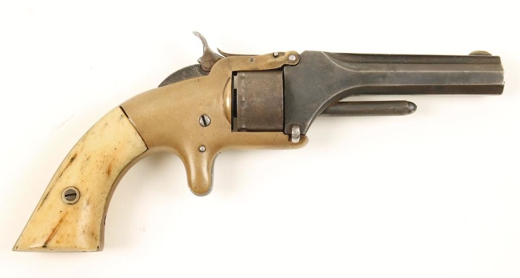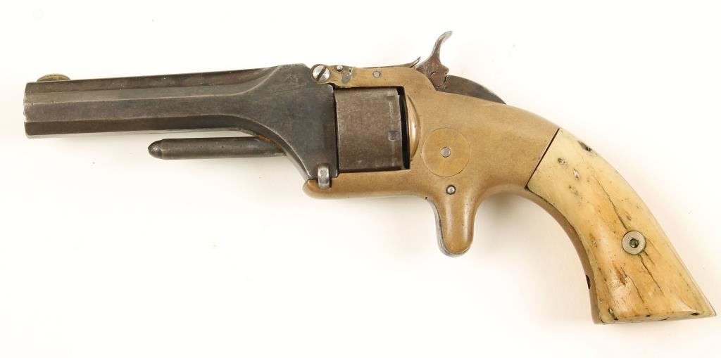 Blued steel and brass single-action spur-triggered 7-shot revolver with a 3-3/16" octagon barrel. Steel finish has turned to a patina with some dings and a few small areas of pitting. Roll stamping is legible with "Smith & Wesson. Springfield. Mass" on the barrel top flat and "Patented April 3, 1855. July 5. 1859 & Dec. 18. 1860" on the cylinder. This has the round frame of the First issue with the cylinder of the Third issue. Bore is shiny with rifling and some pitting. Grips are bone with some voids and a crack by the escutcheon of the left grip. Chambers are not dark but most have small areas of pitting. Condition is good. *Antique Firearm*
