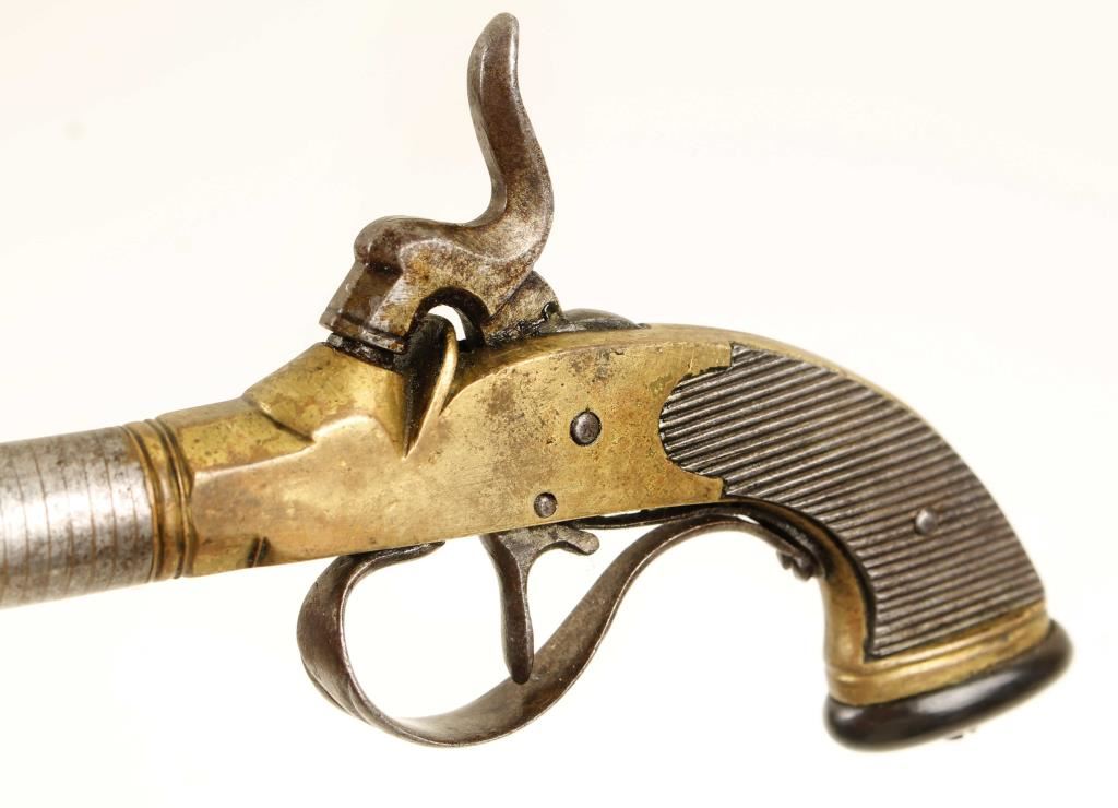 Brace of steel and brass single-shot cap and ball pocket or "muff" pistols with 1-1/2" barrels. Barrels, grip panels, trigger guards, hammers and triggers are steel. Frames are brass. Steel finish is grey patina. Brass is tarnished and dirty. Bores are rough with rifling. Action s work well. Hardwood grip caps have scratches and dings. Includes a hinged top wood case with worn purple lining and form fitting niches for the pistols and loose conical bullets. Condition is fair to good. *Antique Firearm*