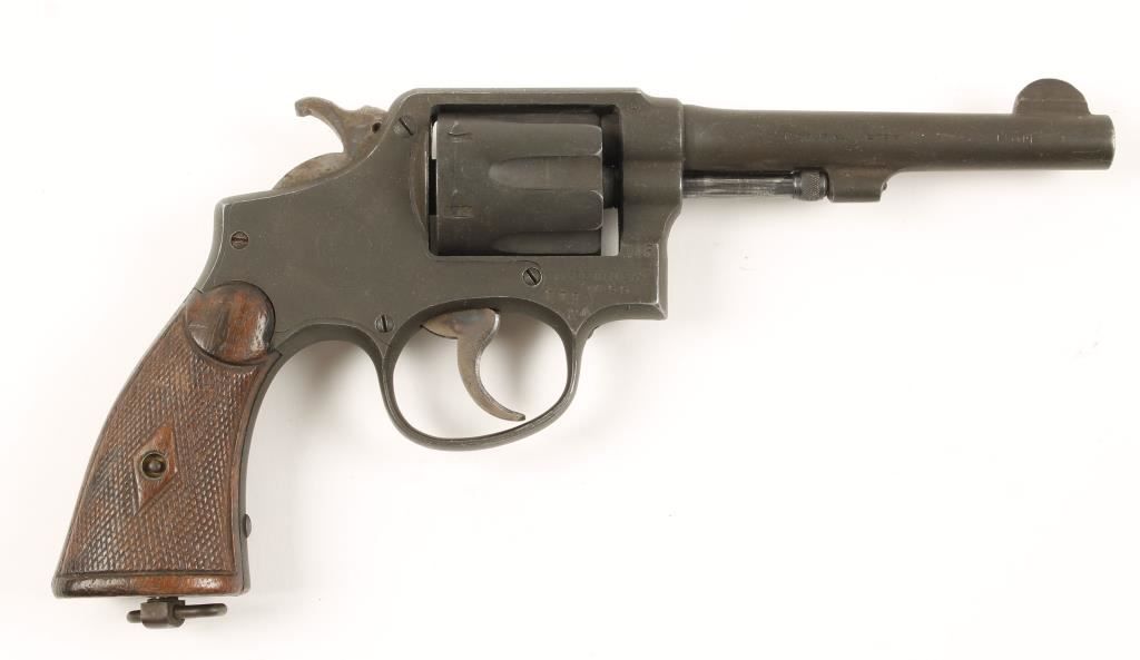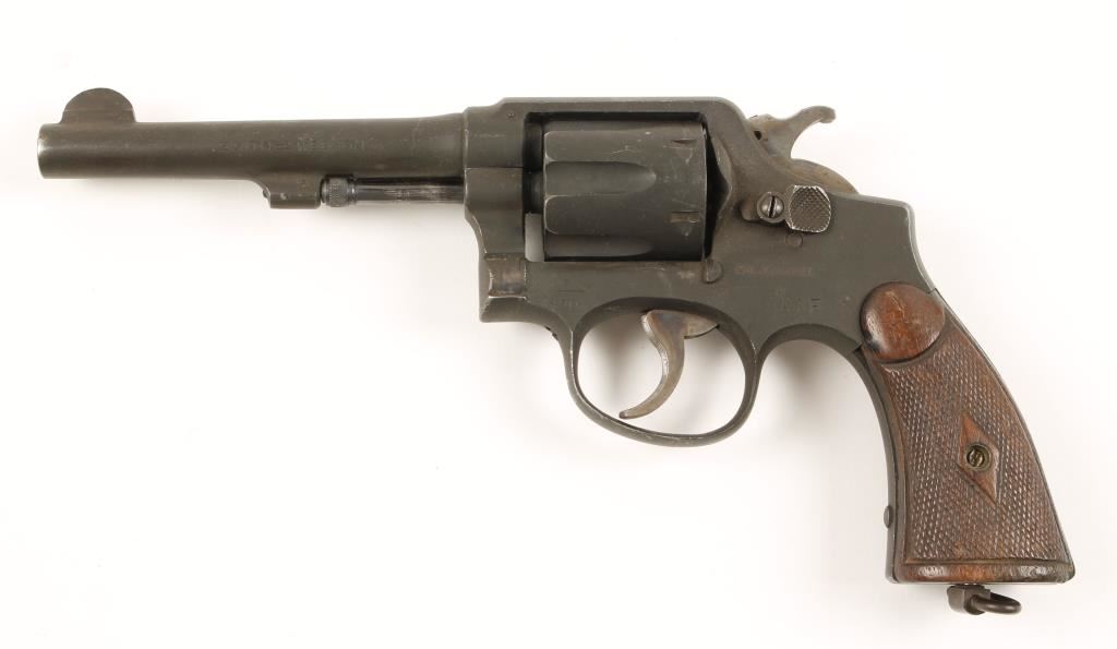 "Black Magic" finished double-action 6-shot revolver with a 5" pinned barrel and a integral front sight. Factory Thorough Rebuild in 1955. Barrel is marked as ".38 S&W Ctg." but there is a small stamping below the cylinder latch that reads, "CAL. .38 SPECIAL". Three British War Dept. Broad Arrow proofs are present, two are bracketed with the letters "AF". There is slight muzzle and edge wear to the finish. Case coloring on the hammer and trigger has faded. The bore and chambers are bright and shiny. The action is good. The grips are worn checkered walnut. Condition is good. *Modern Firearm*