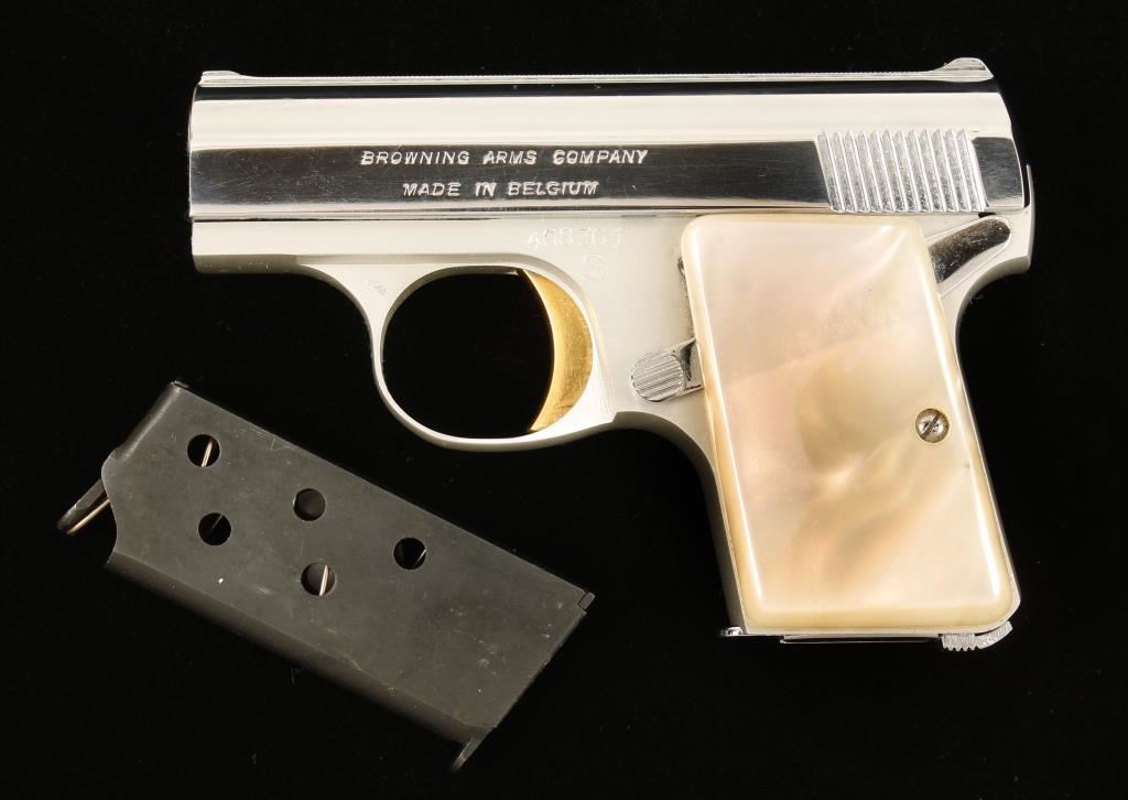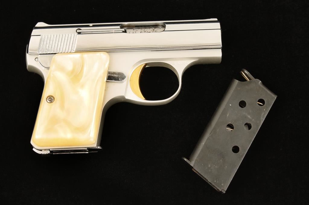 Nickel plated slide and alloy frame single-action semi-automatic hammerless pistol with a 2-1/8" barrel and two magazines. Made in Belgium. Finish is immaculate. Grips are imitation mother-of-pearl and have a few scratches. The bore is mirror bright with sharp rifling. Function is good. Condition is excellent. *Modern Firearm*