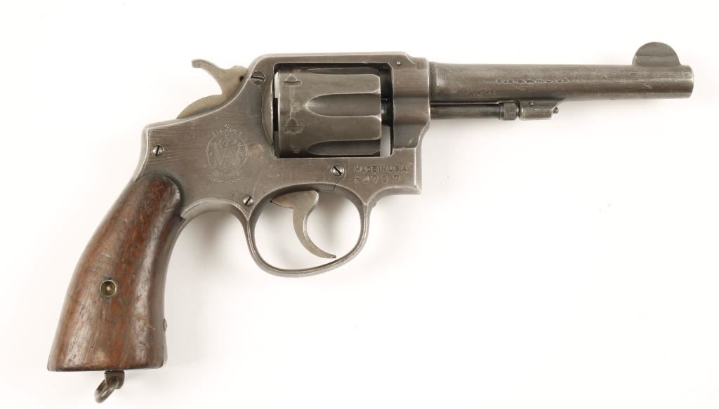 Blued steel double-action 6-shot revolver with a 5" pinned barrel with integral front sight. There are a multitude of British proofs on the frame, barrel and cylinder as well as being marked "United States Property" on the topstrap. Bore and chambers are bright and shiny but need a good cleaning. Action is smooth and tight. Rough machining has left the finish worn to a uniform grey with corner and high point wear. The wooden grips are smooth and unmarked but complete and in good condition. The action is smooth and tight. Condition is good. *Modern Firearm*