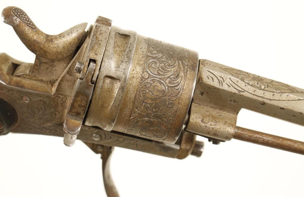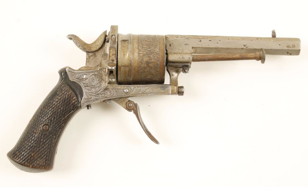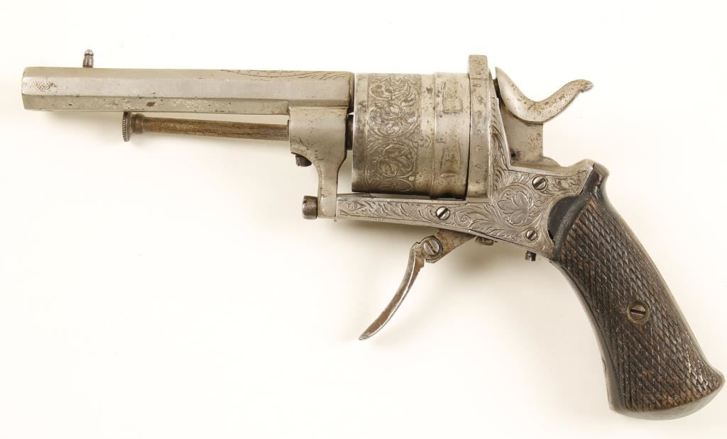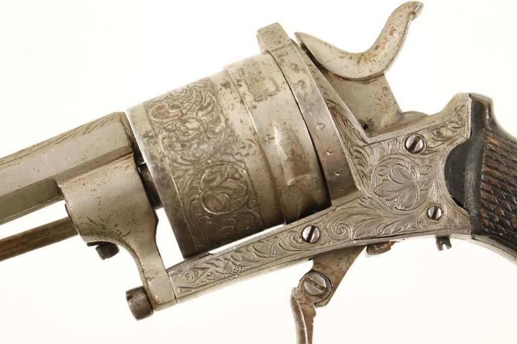 Nickel plated Belgian proofed folding-trigger double-action 6-shot revolver with a 2-7/16" octagon barrel. Engraving on the barrel, cylinder, backstrap and frame. Plating has been lost through flaking and pin-prick pitting. Checkered wood grips are worn with dings but no visible cracks. Action works well. Condition is fair to good. *Antique Firearm*