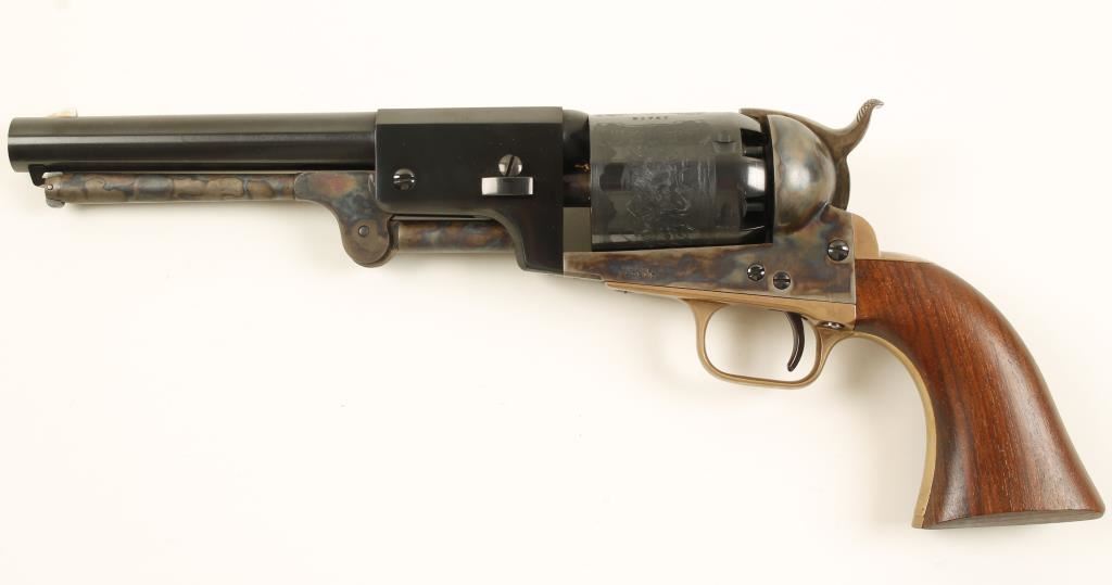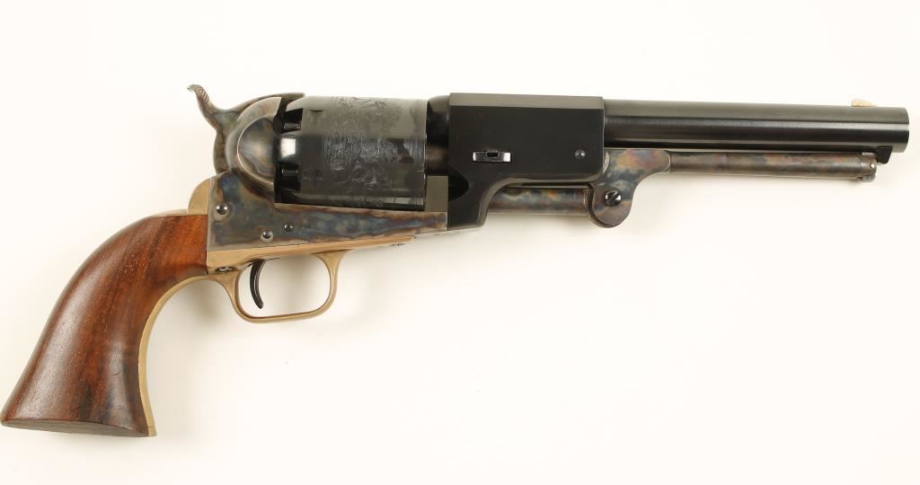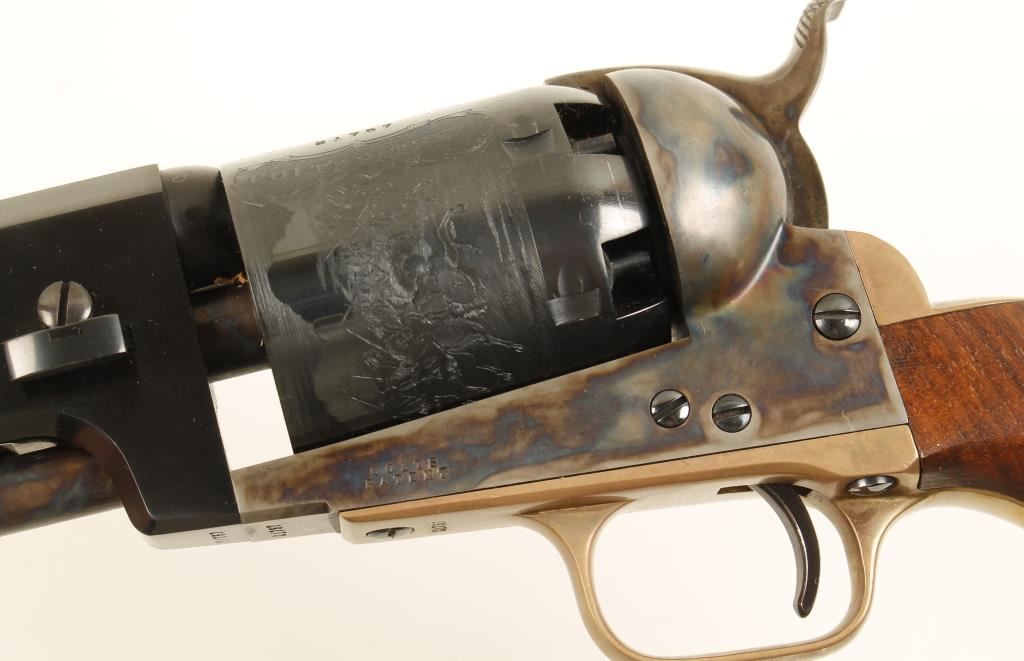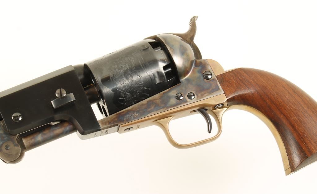 Reproduction blued, case-colored and brass single-action 6-shot open-top percussion revolver with a 7-1/2" barrel. Blued barrel, trigger, cylinder and screws are in excellent condition. Case-colored loading lever, frame and hammer are in great shape. Brass trigger guard and backstrap have a few tiny scratches. Bore and chambers are immaculate. Action is very good and the lock-up is tight. Wood grips are well fitted with sharp edges and have a few tiny dings on them. Cylinder has a roll-stamped naval engagement on it. Condition is excellent. *Antique Firearm*
