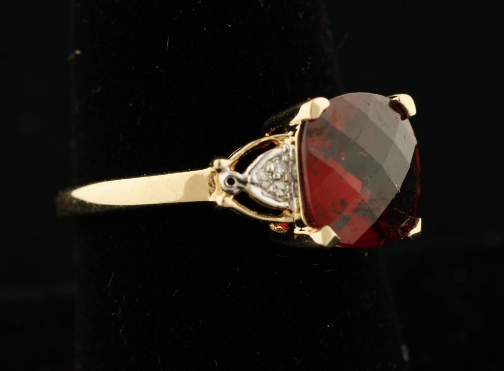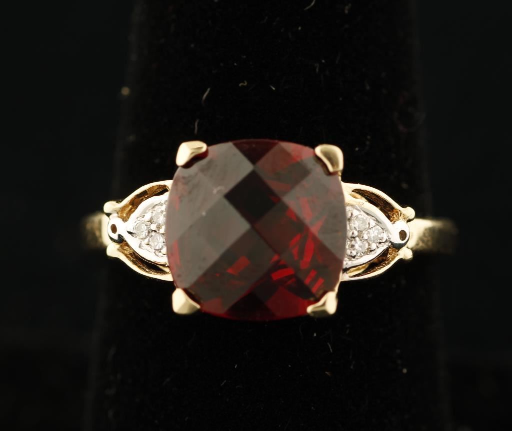 Colorful deep red garnet & diamond ring. The ring features a glowing almost 4 carat garnet with a checkerboard cut top for added sparkle. On the shoulders are 6 nice quality diamonds set to white gold. All set in 14k yellow gold. The ring is size 9 and weighs 3.4 grams.