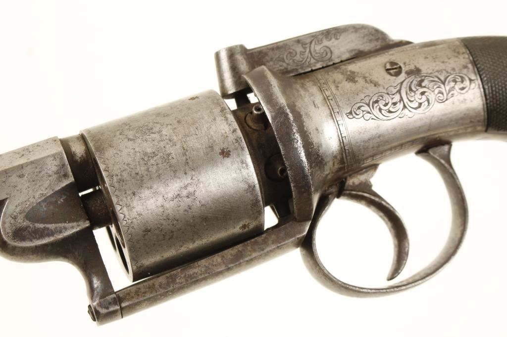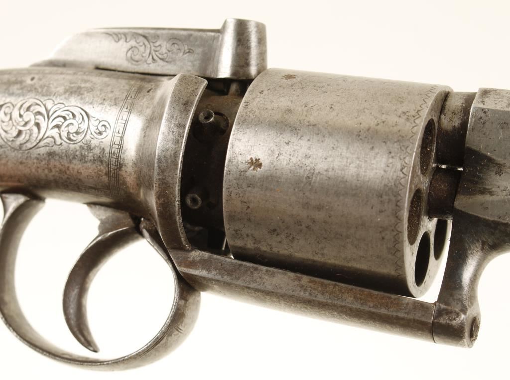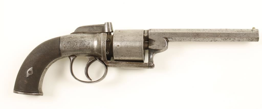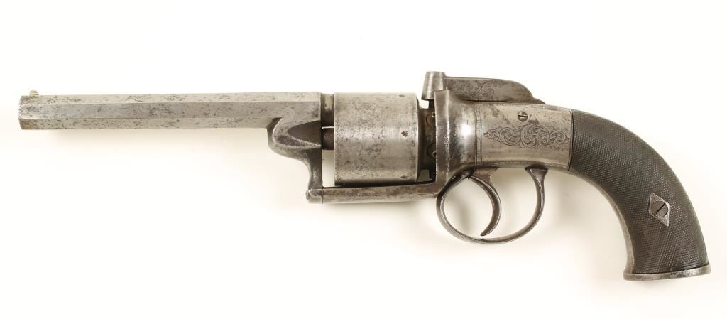 A Birmingham proofed double-action percussion revolver with a 5-11/16" octagon barrel. Steel is worn bare with rust stains and pitting. There are border engravings on the muzzle and the cylinder. There is ornate scroll work engraving on the frame, hammer, grip cap and trigger guard. Bore is heavily pitted and the chambers have some rust. Checkered grips are worn with some dings. Action works well and lock-up is solid. Condition is fair. *Antique Firearm*