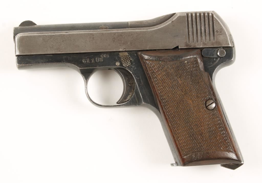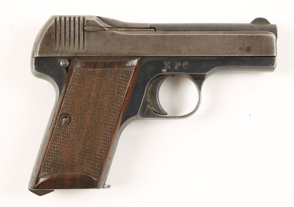 Blued single-action semi-automatic pistol with a 3" barrel and one magazine. Finish in the frame shows a few specks of surface rust. The slide has faded to a silver grey. The bore is bright with rifling but has evidence of pitting. The wooden grips are in pretty good shape with a dished section adjacent to the safety lever and only a small sliver under the right grip by the backstrap. The initials "EPC" have been stamped into the bottom of the right grip. The action does not cock. Condition is good. *Modern Firearm*